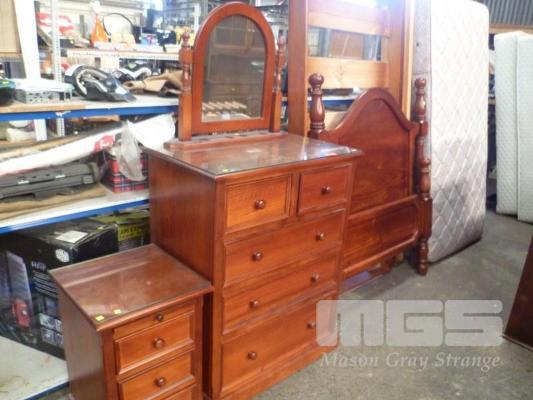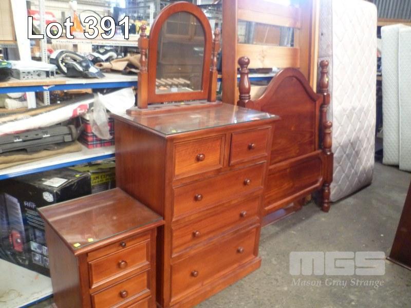 PINE BEDROOM SUITE INC SINGLE BED WITH MATTRESS, TALLBOY, BEDSIDE CABINET & VANITY MIRROR