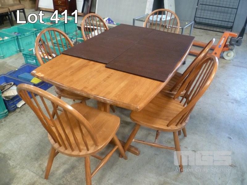 TIMBER 7 PIECE DINING SUITE INC RECTANGULAR DINING TABLE, STRETCHER BASE WITH 6 x SPINDLE BACK, ARCHED, DINING CHAIRS