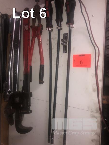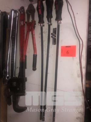 CONTENTS OF BOARD, BOLT CUTTERS, STILSON, LARGE SHIFTERS, LONG RIDGE FLEXIBLE DRIVES, GALLERY BRUSHES