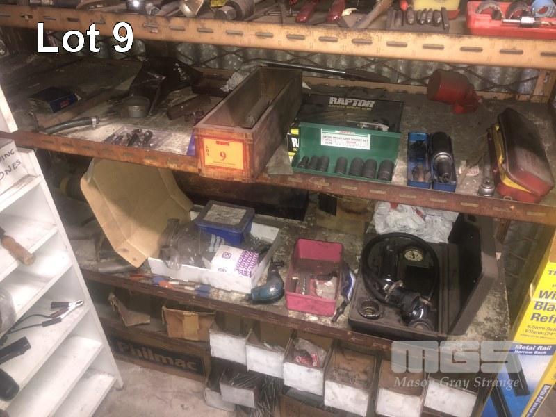 CONTENTS OF RACK, ASSORTED TOOLS, IMPACT SOCKETS, IMPACT SCREW DRIVER, PRESSURE TEST KIT, VARIOUS SPECIALTY TOOLS & HARDWARE