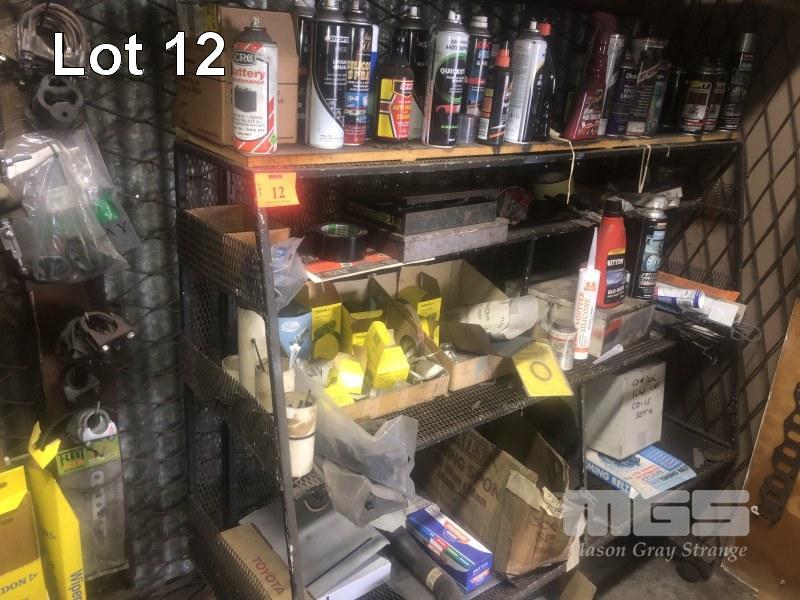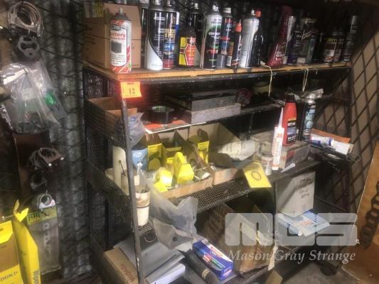 MOBILE RACK & CONTENTS, ASSORTED EXHAUST CLAMPS, HOSE CLAMPS, AEROSOL CANS, SPRAY PAINTS & AUTOMOTIVE PARTS