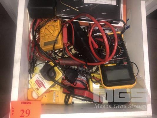 CONTENTS OF DRAWER, 2 x MULTIMETERS, LAUNCH SCAN TOOL, DASHBOARD SERVICE KIT, ASSORTED SPECIALTY TOOLS