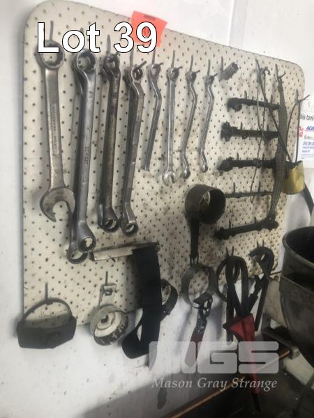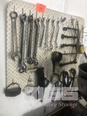 CONTENTS OF SHADOW BOARD, ASSORTED TOOLS & WRENCHES, SUMP PLUG & OIL FILTER REMOVAL TOOLS, VARIOUS TYPES