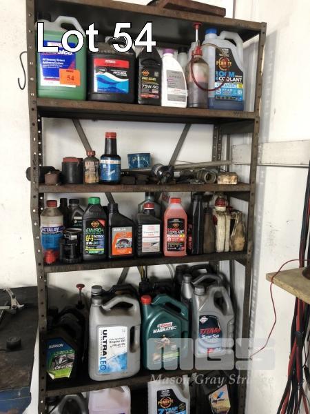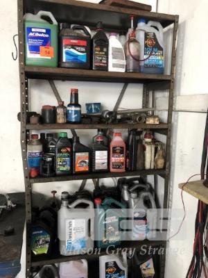 SHELF & CONTENTS, ASSORTED COOLANTS, OILS, INCLUDING ENGINE & GEAR OIL, PART CONTAINERS ONLY, SHELF 2200 x 900 x 400mm