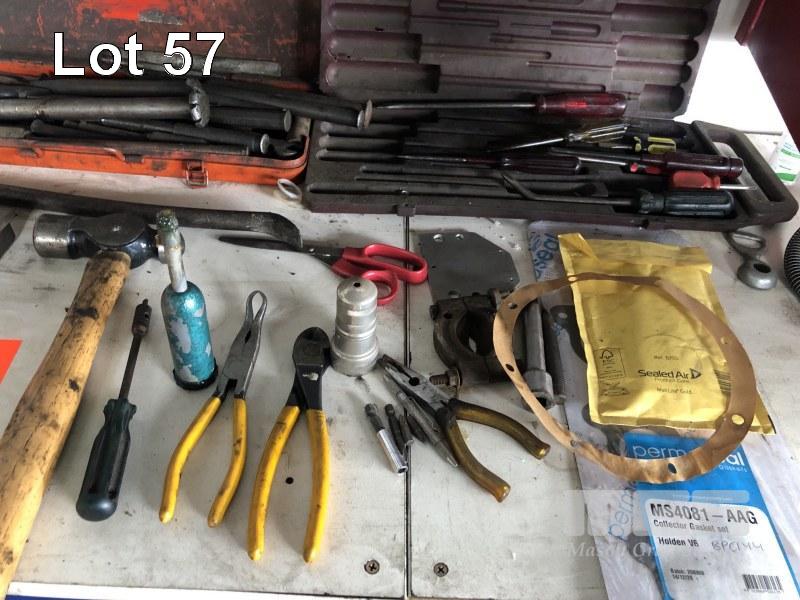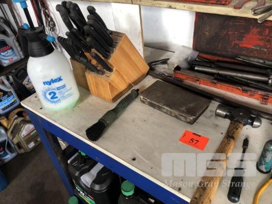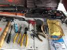 CONTENTS OF BENCH TOP, SCREWDRIVERS, PUNCHES, PLIERS, CUTTERS, KNIFE SETS, GRAB KIT, SPRAY BOTTLE, SPECIALTY PUNCHES, HAMMER ETC.