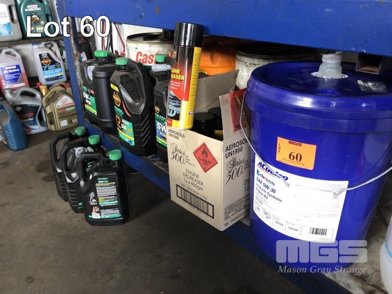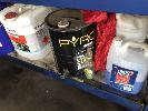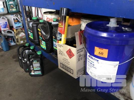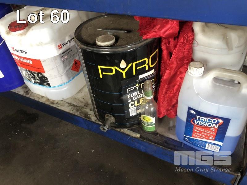 CONTENTS UNDER BENCH, PART DRUMS OF VARIOUS PETROL & DIESEL OILS, BRAKE CLEANER, WINDOW WASH ETC. APPROX 16 x DRUMS & CONTAINERS PLUS 5 x CANS OF ENGINE DEGREASER AEROSOL