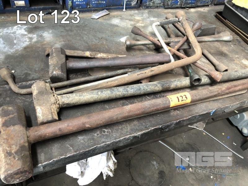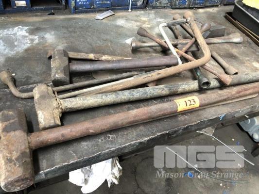 ASSORTED WORKSHOP TOOLS INCLUDING, SLEDGE HAMMERS, WHEEL BRACES, TYRE LEVERS, ETC.