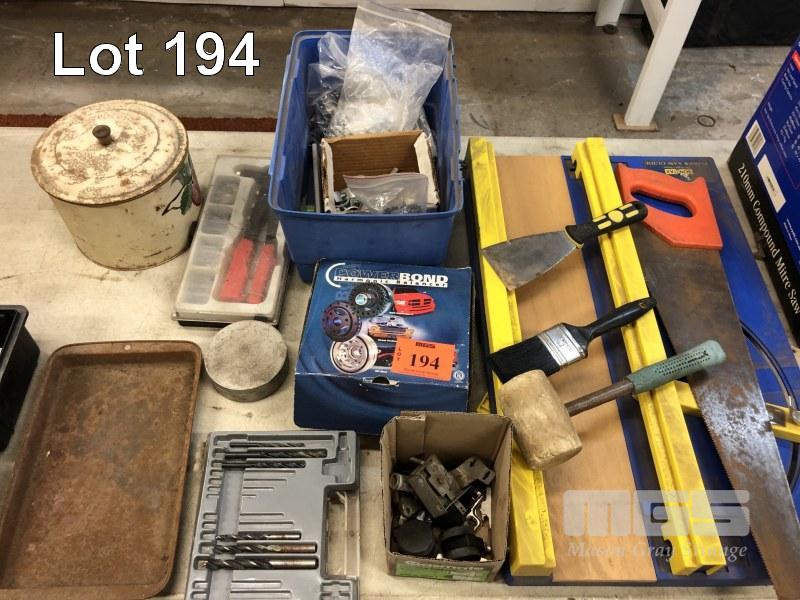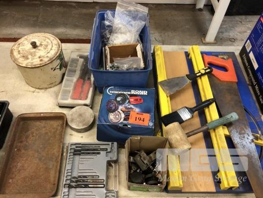 ASSORTED HARDWARE, CARPENTRY TOOLS, POP RIVETER, HANDSAW, SONTAX POWER SAW GUIDE