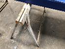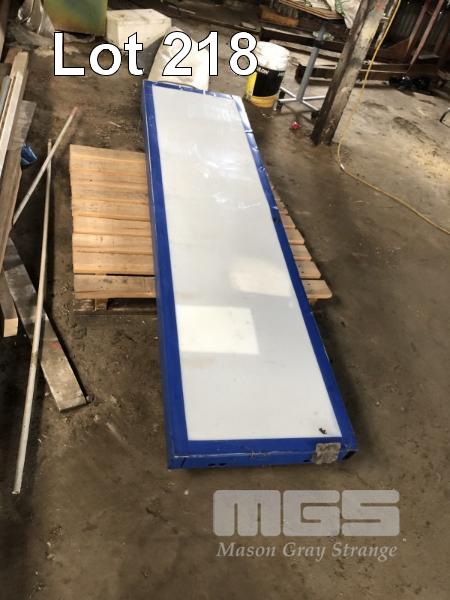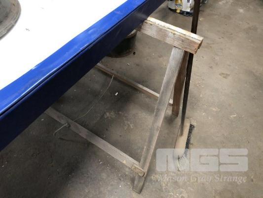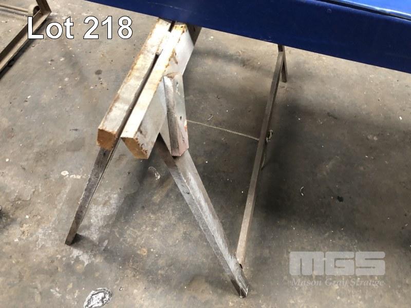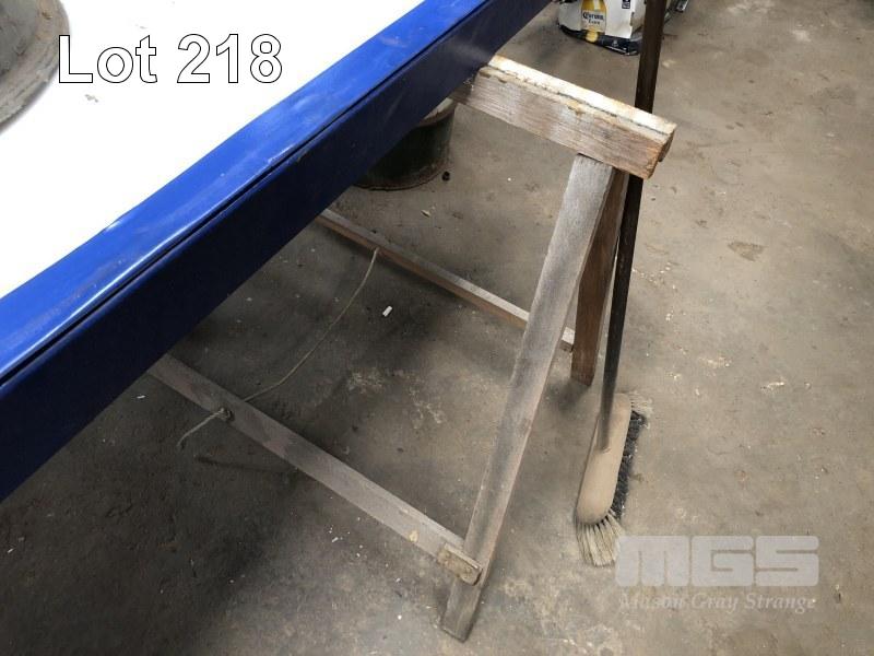 2 x WOODEN WORK STANDS, 2 x STEEL FRAMES WITH PERSPEX COVERS
