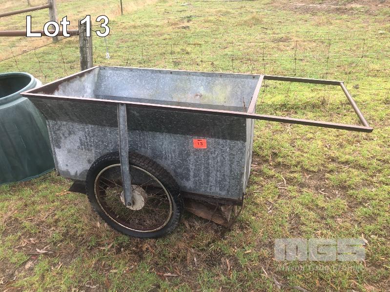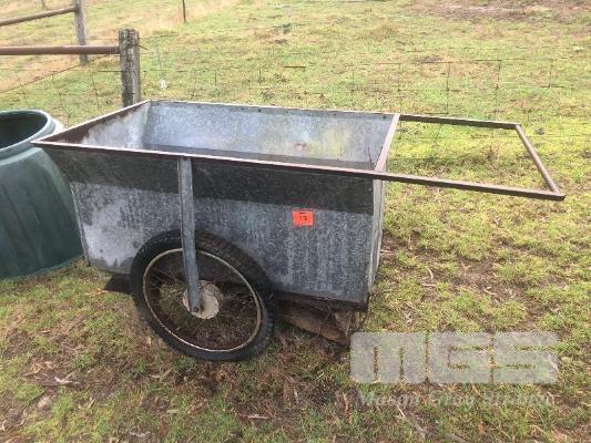 FARM ART, OLD SCHOOL WALK BEHIND WIRE WHEEL TROLLEY