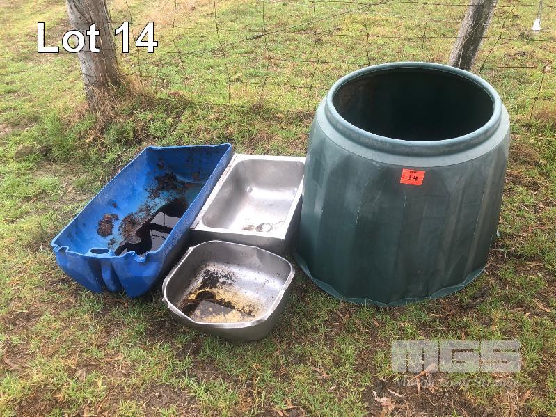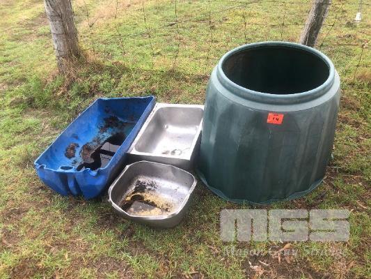 2 x STAINLESS STEEL FEED BOWLS, 1 x POLY FEED DRUM, 100L, PLUS GARDEN COMPOST BIN, NO LID
