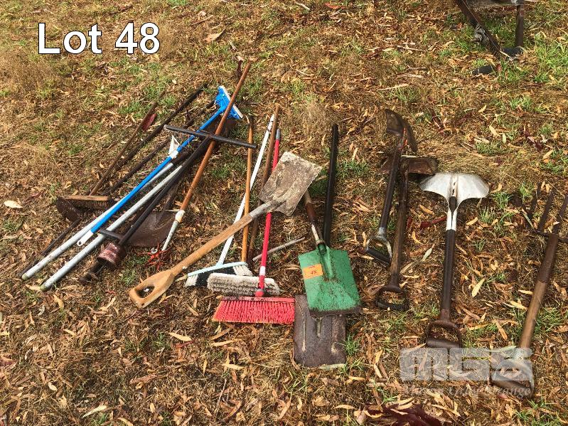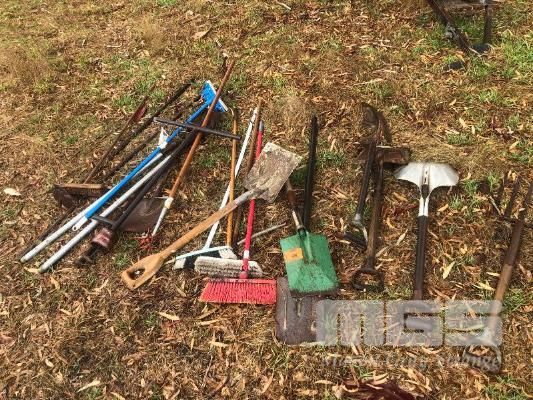 ASSORTED HAND TOOLS, BROOMS, POST HOLE DIGGER, SHOVELS, FORK, CROW BAR ETC.