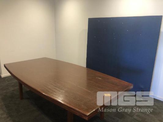 TIMBER MEETING TABLE, 2400 x 1200mm, HIGH RISE GAS LIFT STOOL, CLOTH ROOM DIVIDER, 1800 x 1800mm, JVC TV/CD PLAYER, 32", LED HDMI, CUTLERY & CHINA, (CONTENTS MEETING ROOM)