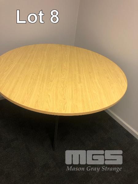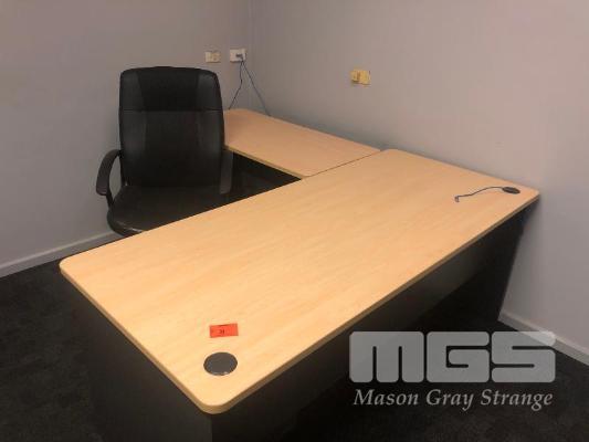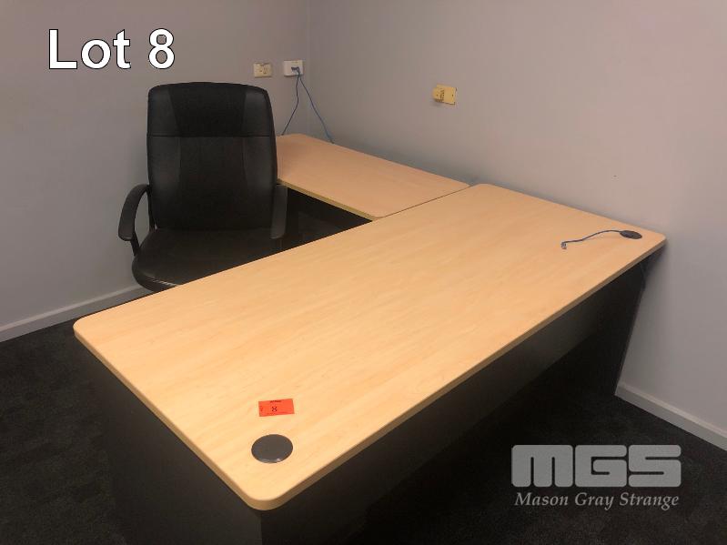 TIMBER LAMINATE DESK & RETURN, 1800 x 2000mm, UNDER DESK 3 DRAWER MOBILE, GAS LIFT OFFICE CHAIR, MATCHING 1200mm DIAMETER MEETING TABLE & 2 x TIMBER LAMINATE BOOKSHELVES 1800 x 2000 x 800mm
