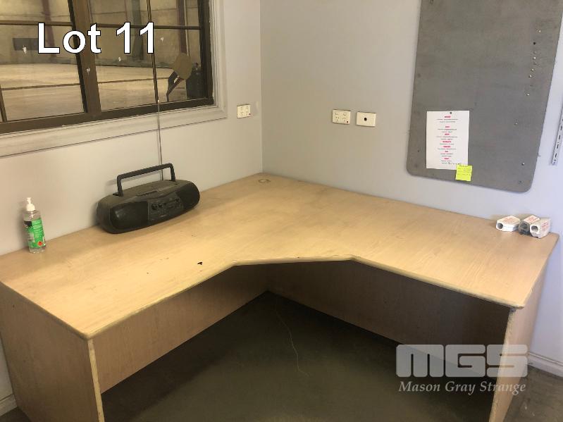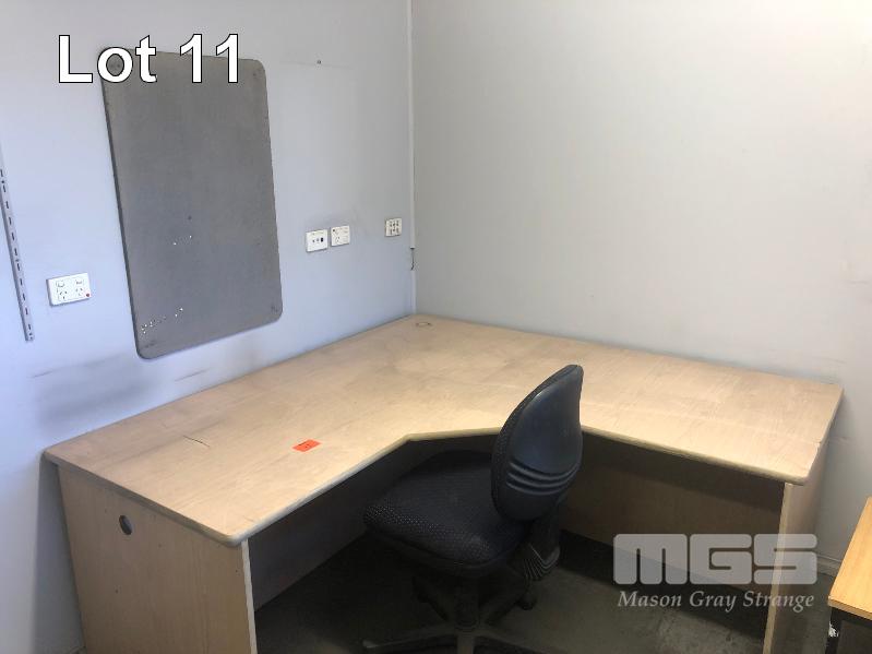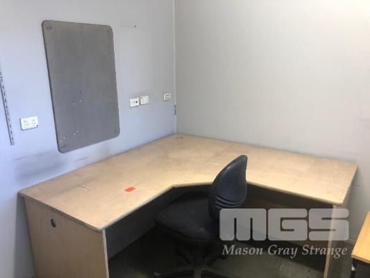 2 x CORNER DESKS, 1800 x 1800mm, GAS LIFT OFFICE CHAIRS, 2 x PINBOARDS & WHITEBOARD, (CONTENTS WAREHOUSE OFFICE)