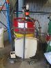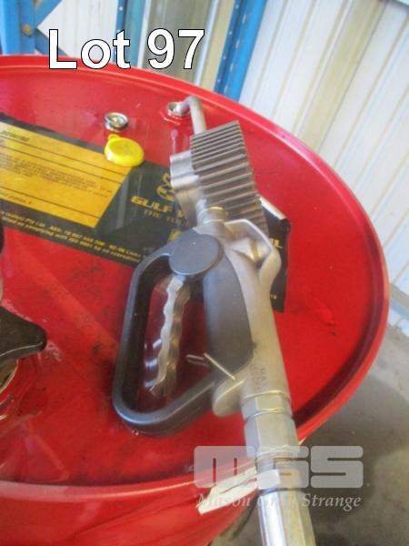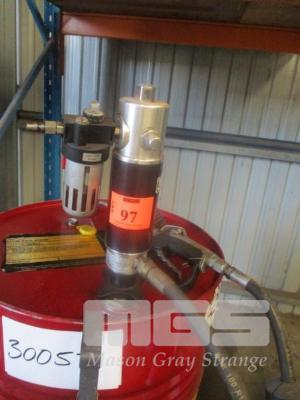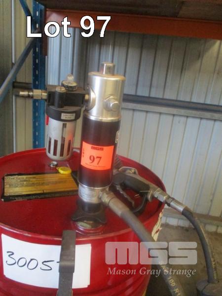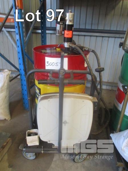 STM LUBE WORKS PNEUMATIC OIL DRUM PUMP & HOSE REEL, ON TROLLEY