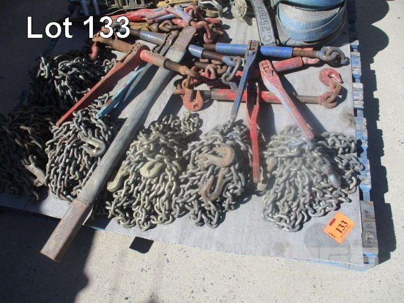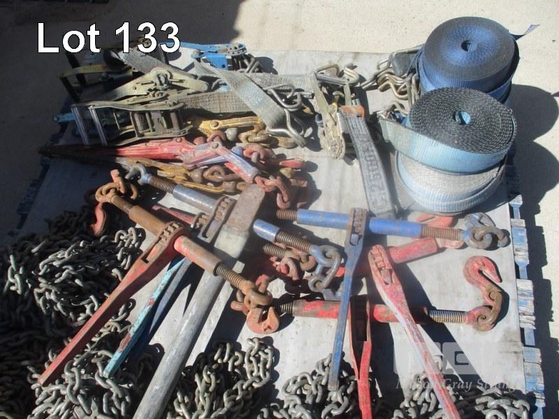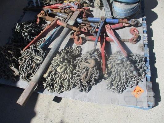 PALLET LOT ASSORTED LOAD GEAR, 8 x LOAD STRAPS & RATCHETS, 6 x CHAINS, 6 x WIND UP DOGS, 4 x OVER CENTER DOGS