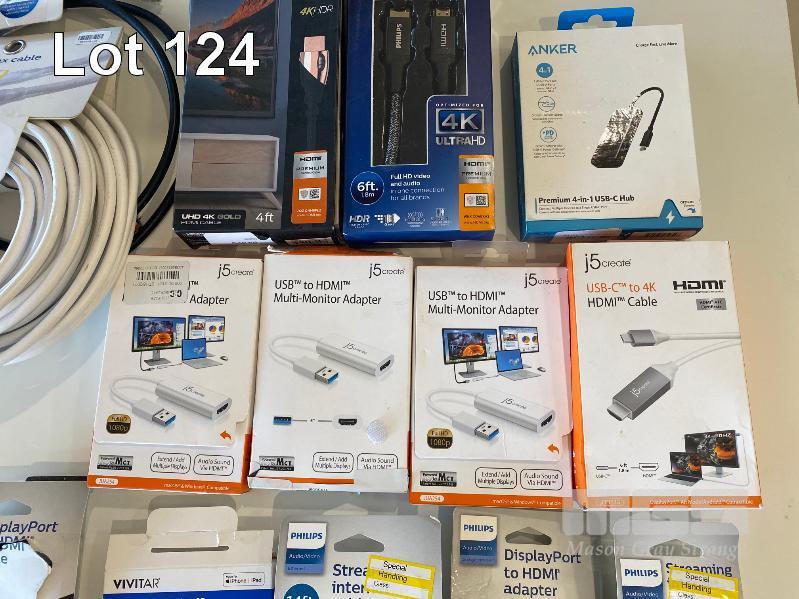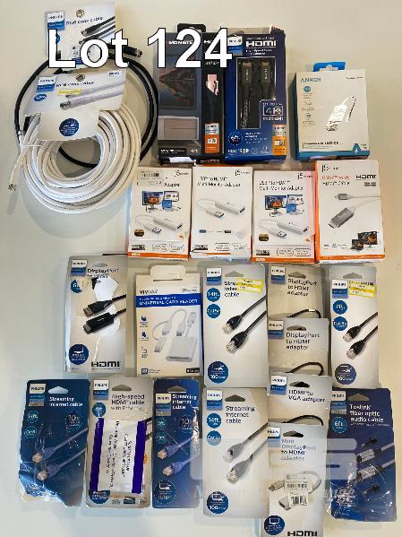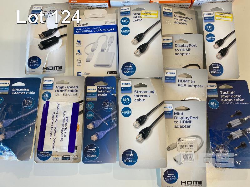 22 x ASST ACCESSORIES INC. COAX CABLES, HDMI CABLES, USB-C HUB, USB TO HDMI ADAPTERS, UNIVERSAL CARD READER, NETWORK CABLES, DISPLAYPORT TO HDMI ADAPTERS (OPEN BOX)