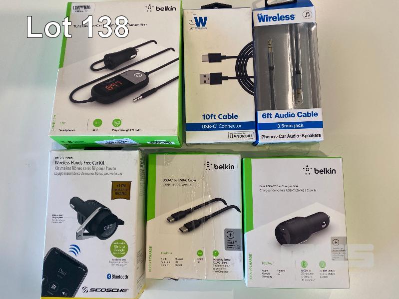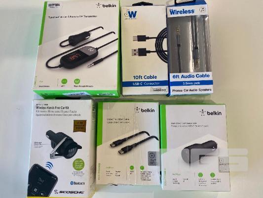 6 x ASST ACCESSORIES INC. FM TRANSMITTER, USB-C CABLES, WIRELESS HANDS-FREE CAR KIT, USB-C CAR CHARGER, 3.5mm AUDIO CABLE (OPEN BOX)