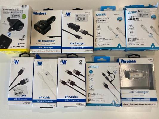 10 x ASST ACCESSORIES INC. WIRELESS HANDS-FREE CAR KIT, FM TRANSMITTER, CAR CHARGERS, LIGHTNING CABLES, USB-C CABLES (OPEN BOX)