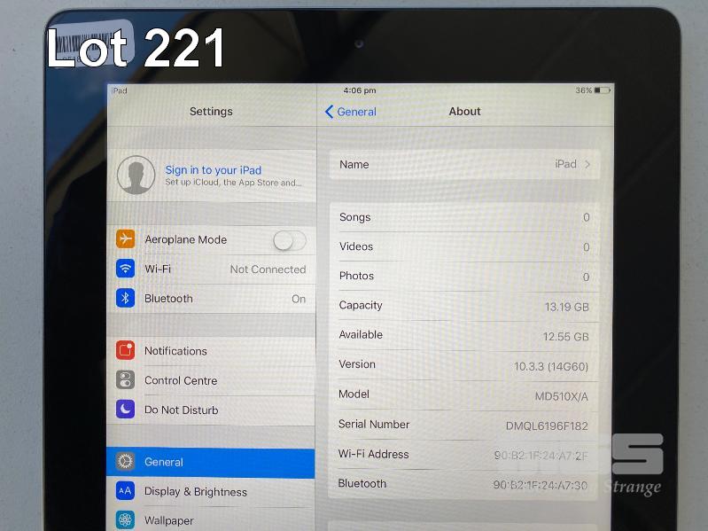 APPLE iPAD 4TH GEN, 16GB, Wi-Fi, SPACE GREY, MODEL A1458 (NO CABLE, NO CHARGER) S/N:DMQL6196F182