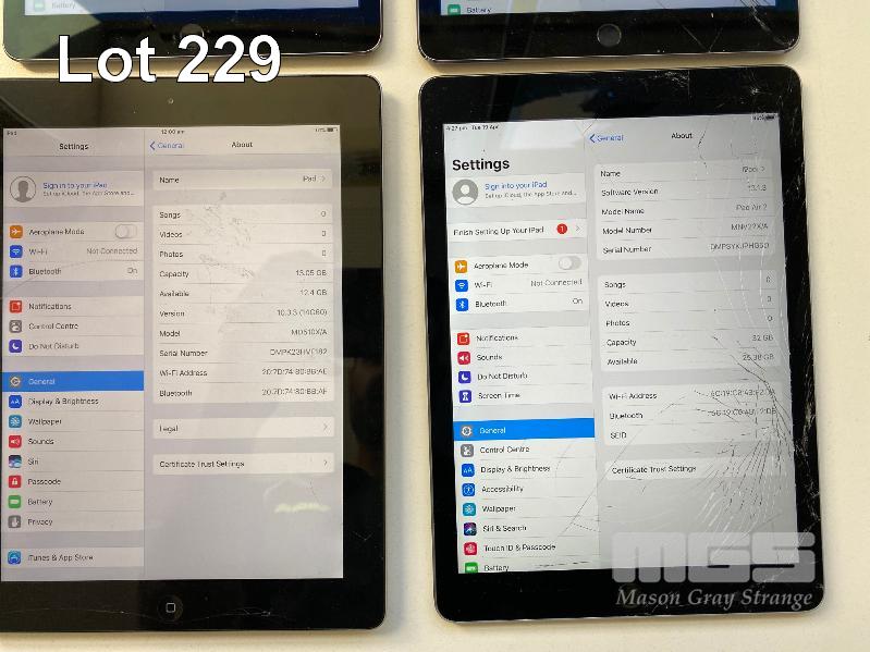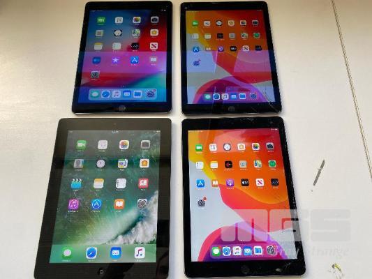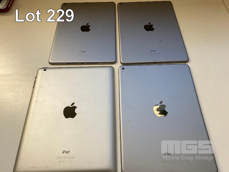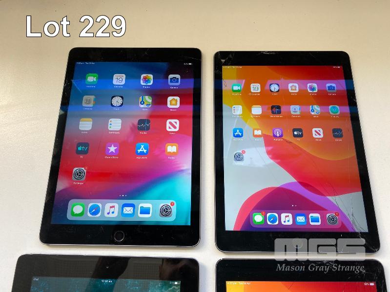 3 x APPLE iPAD AIR 2, 32GB, Wi-Fi, SPACE GREY, MODEL A1566 1 x APPLE iPAD 4TH GEN, 16GB, Wi-Fi, SPACE GREY, MODEL A1458 (NO CABLES, NO CHARGERS) (NOTE: ALL VARIOUS DAMAGE)