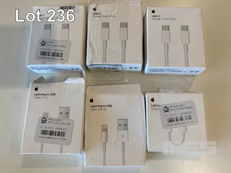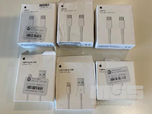 6 x ASST APPLE ACCESSORIES INC. 3 x USB-C CABLE (2m), LIGHTNING TO USB (2m), LIGHTNING TO USB (0.5m), LIGHTNING TO HEADPHONE JACK (OPEN BOX)