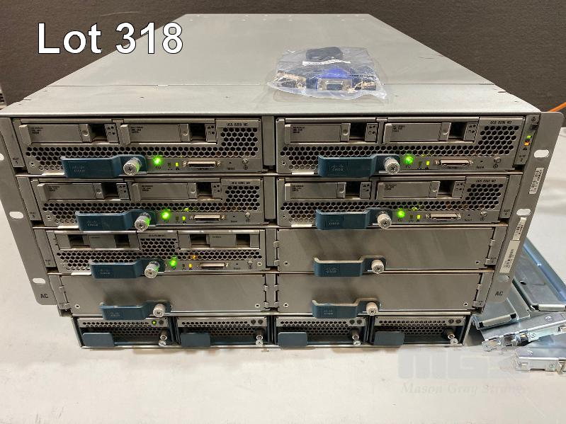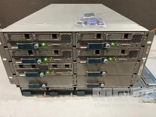 CISCO N20-C6508 V02 BLADE ENCLOSURE WITH 5 x CISCO BLADE SERVERS - CISCO UCS B200 M2, 2 x XEON E5620 @ 2.4GHz, 48GB ECC DDR3 RAM, 2 x 300GB SAS HDD - CISCO UCS B200 M2, 2 x XEON X5650 @ 2.67GHz, 48GB ECC DDR3 RAM, 2 x 300GB SAS HDD - CISCO UCS B200 M2, 2 x XEON E5620 @ 2.4GHz, 48GB ECC DDR3 RAM, 2 x 300GB SAS HDD - CISCO UCS B200 M2, 2 x XEON X5650 @ 2.67GHz, 48GB ECC DDR3 RAM, 2 x 300GB SAS HDD - CISCO UCS B200 M3, 2 x XEON E5-2640 @ 2.5GHz, 48GB ECC DDR3 RAM, NO HDD WITH 2 x CISCO UCS 2208XP MODULES & RAILS (NO 15A POWER CABLES) S/N:FOX1606H68N