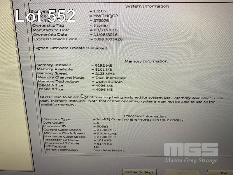 LAPTOP, DELL LATITUDE E5570, CORE i5 6440HQ (6TH GEN) @ 2.6GHz, 8GB DDR4 RAM, 256GB SSD, 15.6" WIDESCREEN (1920x1080), INTEL SKYLAKE GRAPHICS, Wi-Fi, BLUETOOTH, WINDOWS 10 HOME INSTALLED & POWER SUPPLY S/N:HWTNQC2