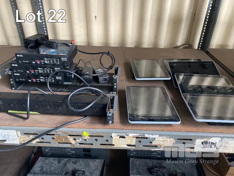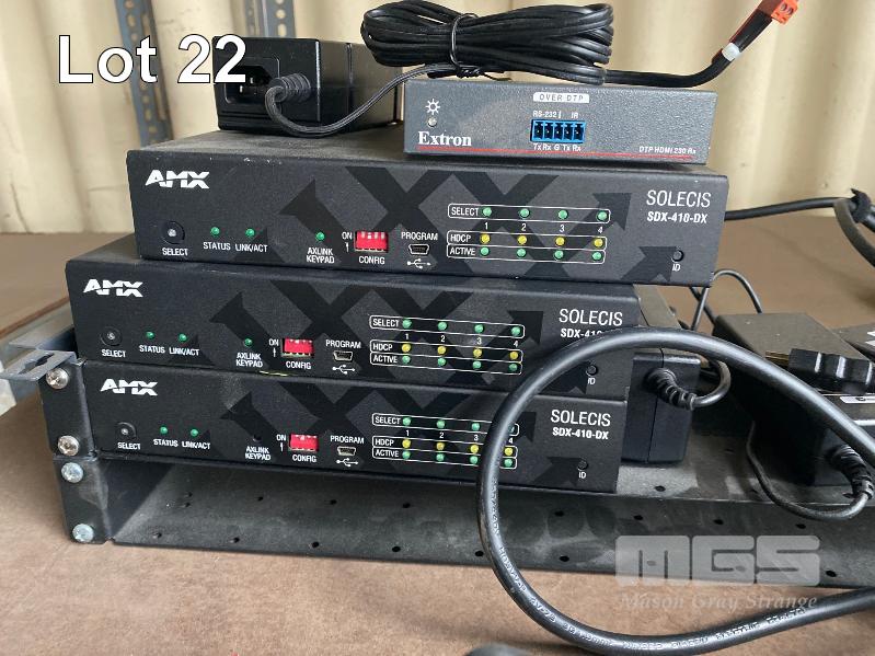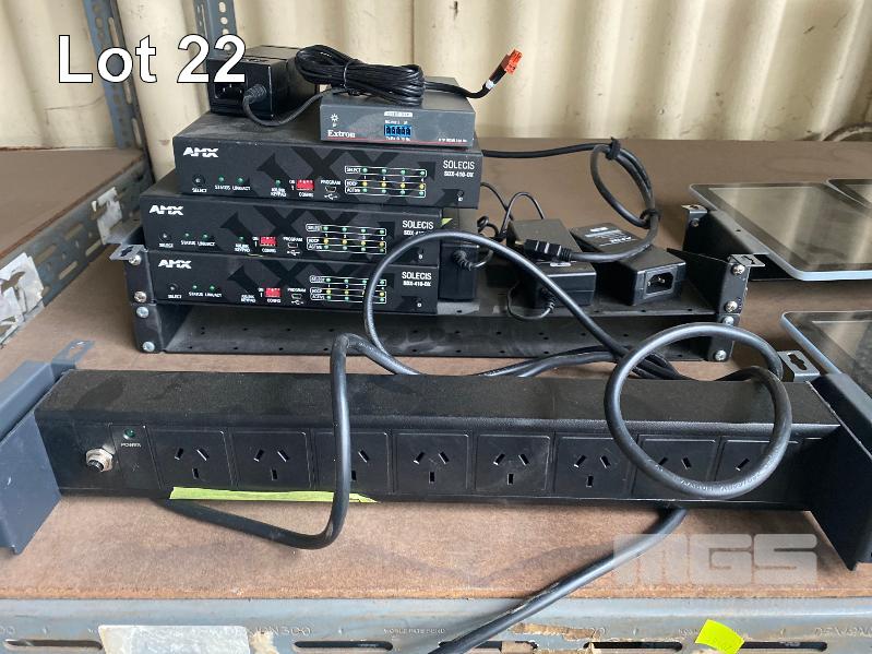1 x RACKMOUNT POWER BOARD, 3 x AMX SOLECIS SDX-410-DX HDMI SWITCHERS, 1 x EXTRON DTP HDMI 230 Rx RECEIVER, 6 x 10.1" INTERACTIVE ROOM TOUCHSCREENS, MODEL ROOM-10T-POE-LED (NO POWER SUPPLIES)