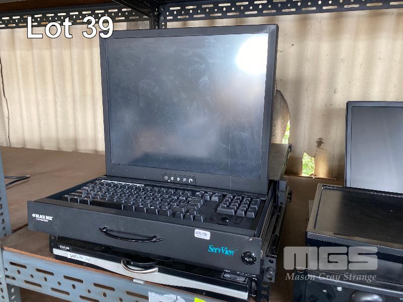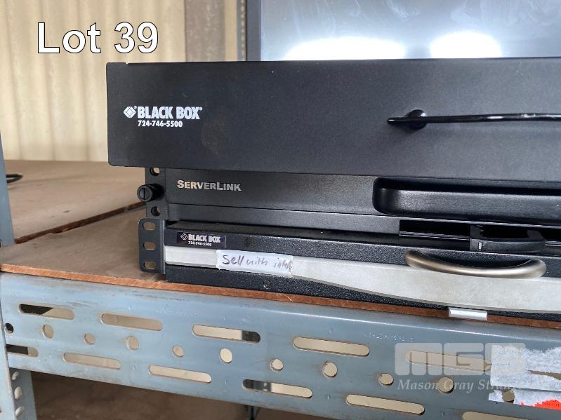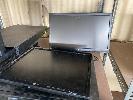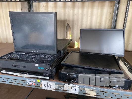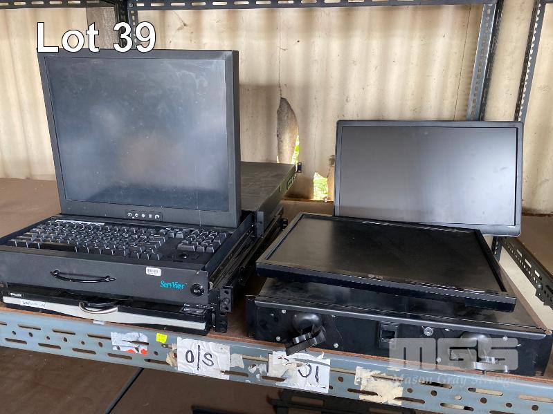 3 x ASST RACKMOUNT LCD MONITOR TRAYS (NO POWER SUPPLIES), 1 x HP 20" LCD MONITOR, 1 x LG MONITOR (NO STAND), 1 x RACKMOUNT STORAGE TRAY