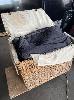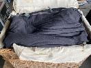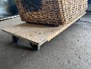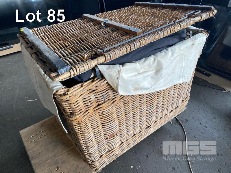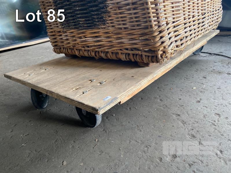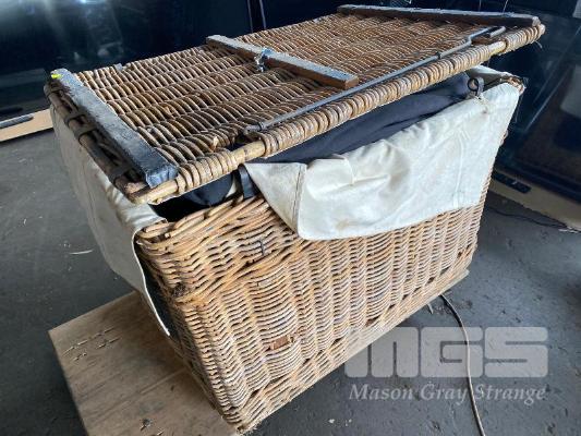 CANE BASKET, 68 x 100 x 74cm COMPRISING BACKDROP CURTAINS ON TIMBER DOLLY