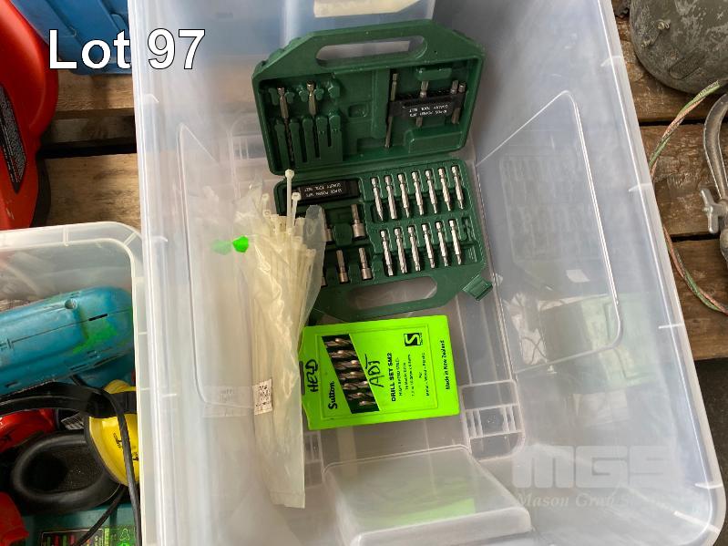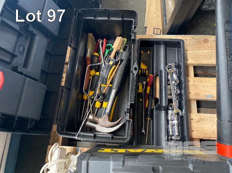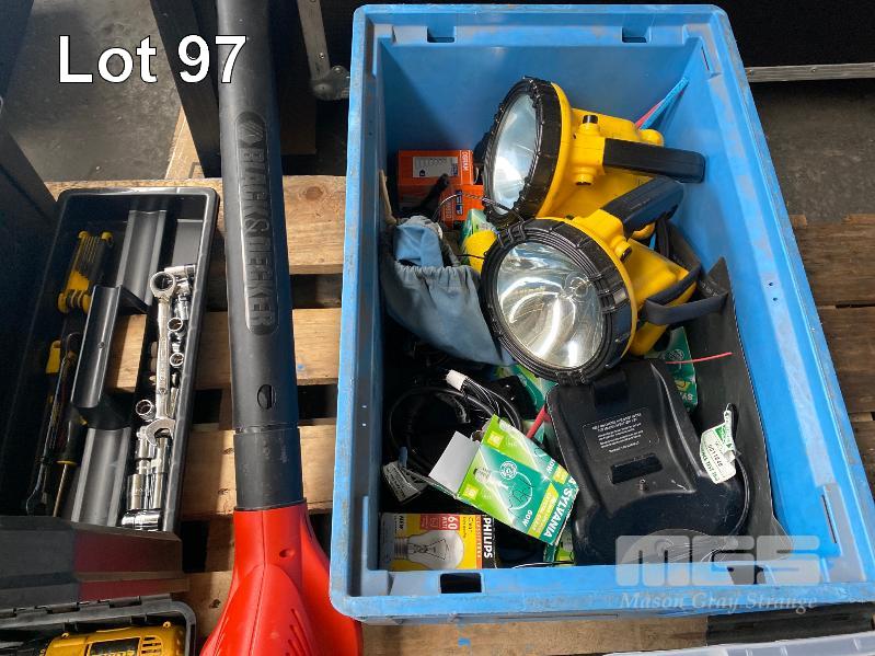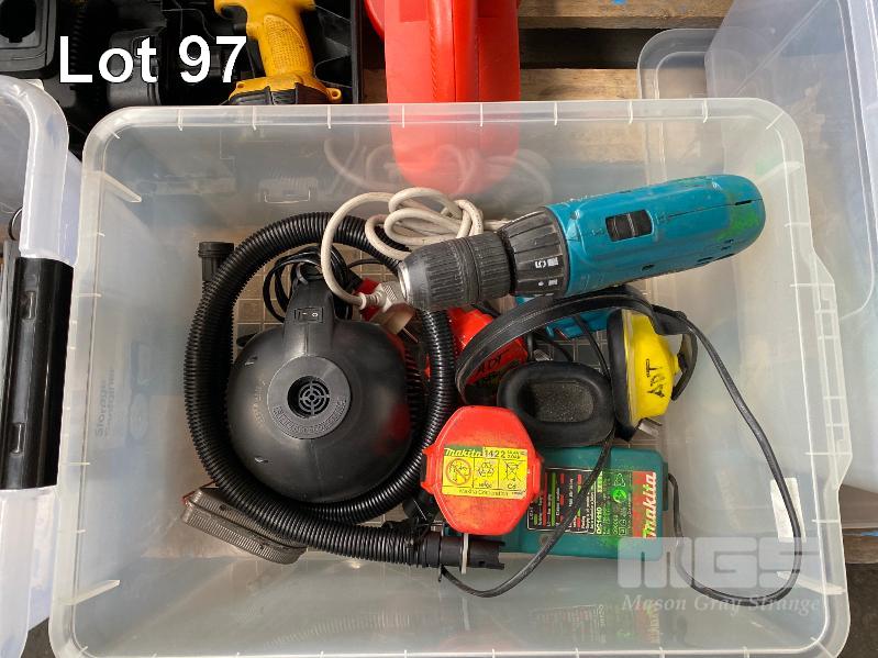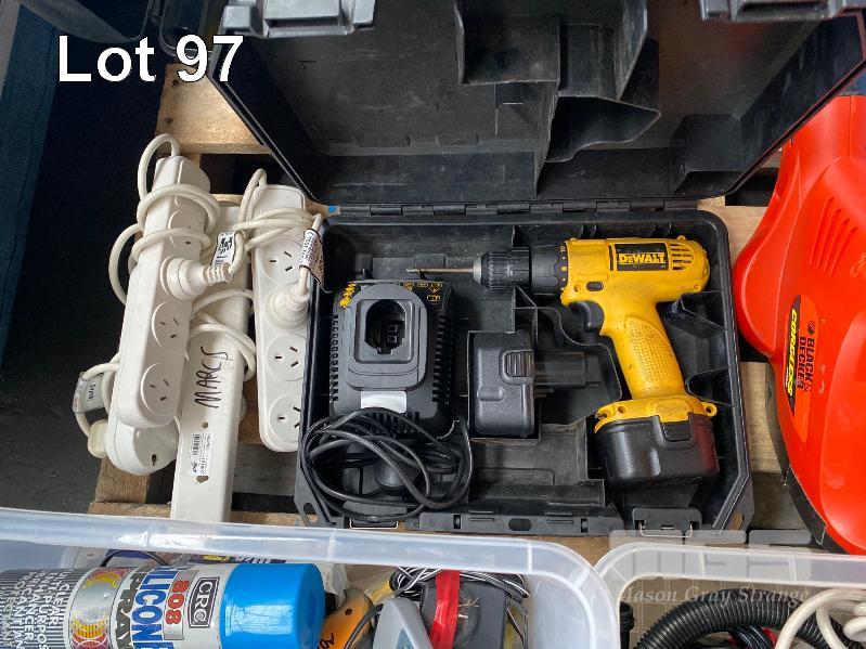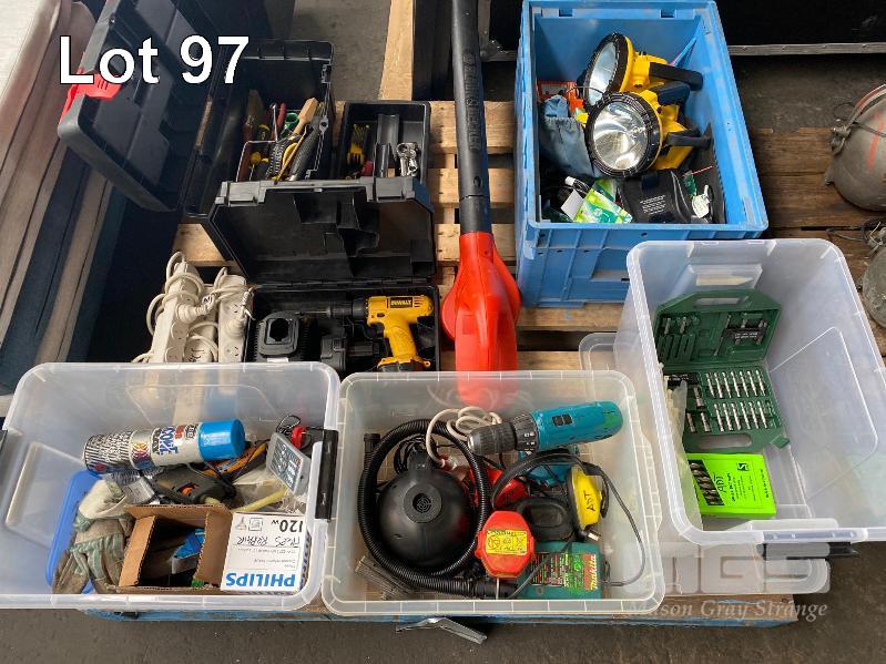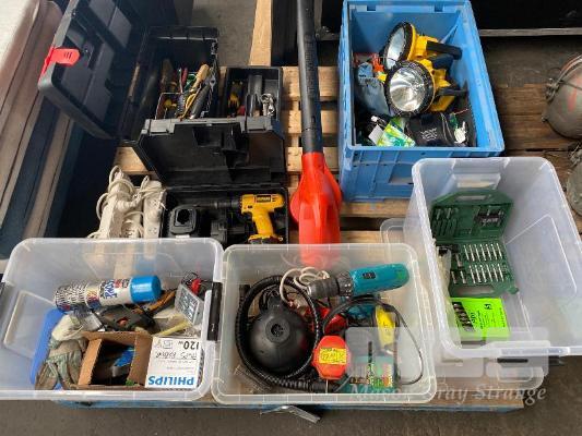1 x PALLET OF ASST TOOLS, TOOL BOX, BLOWER, DEWALT DRILL, INFLATOR, DRILL BITS, POWER BOARDS ETC