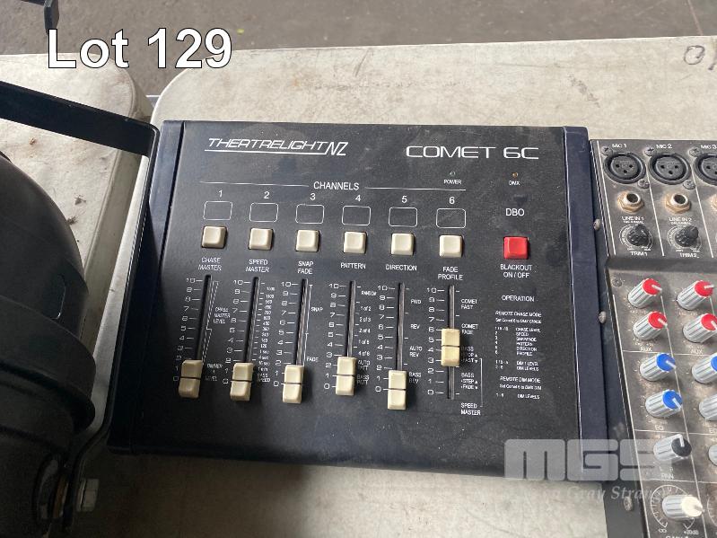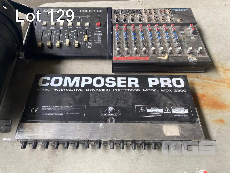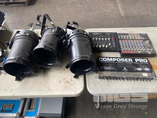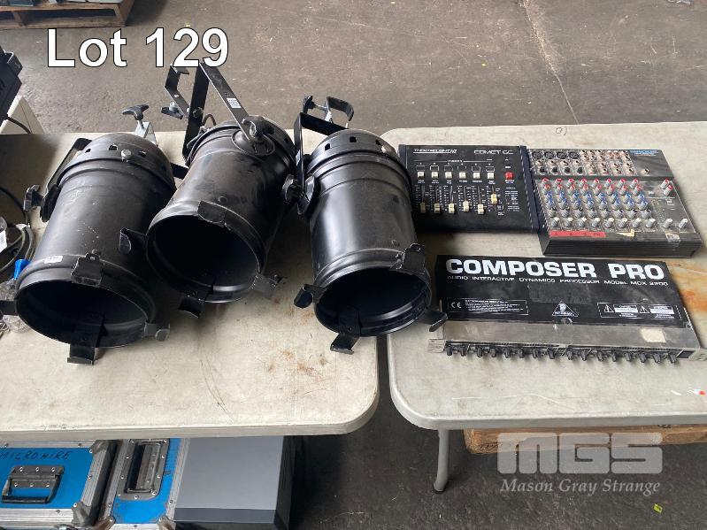 3 x PAR CAN LIGHTS (2 x NO GLOBES), BEHRINGER MDX2200 AUDIO PROCESSOR, MACKIE 1202 12-CHANNEL MIXER, THEATRELIGHT NZ COMET 6C DIMMER (NO CABLES)