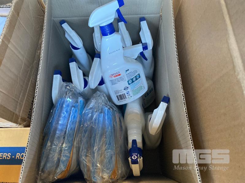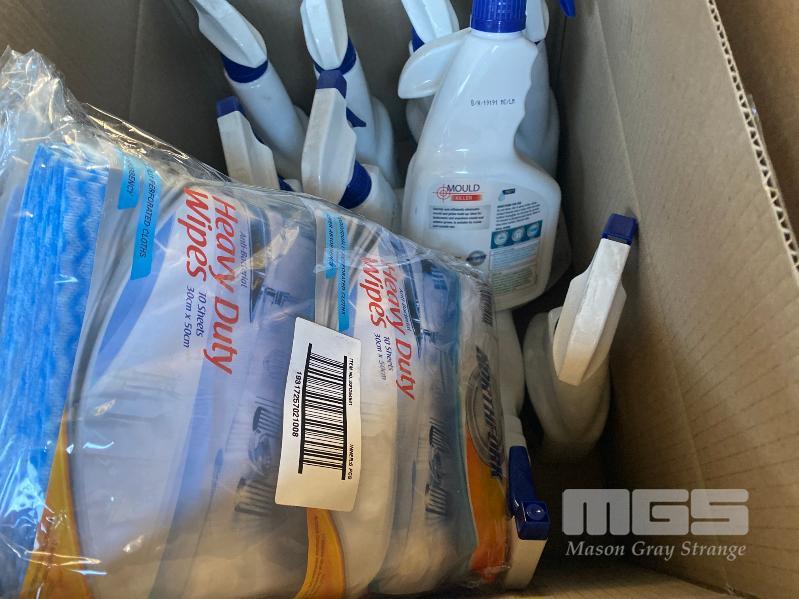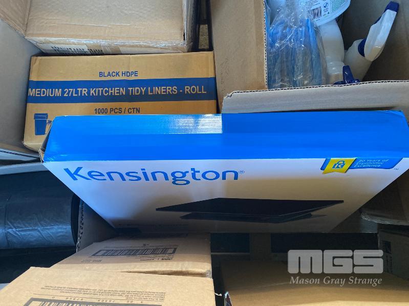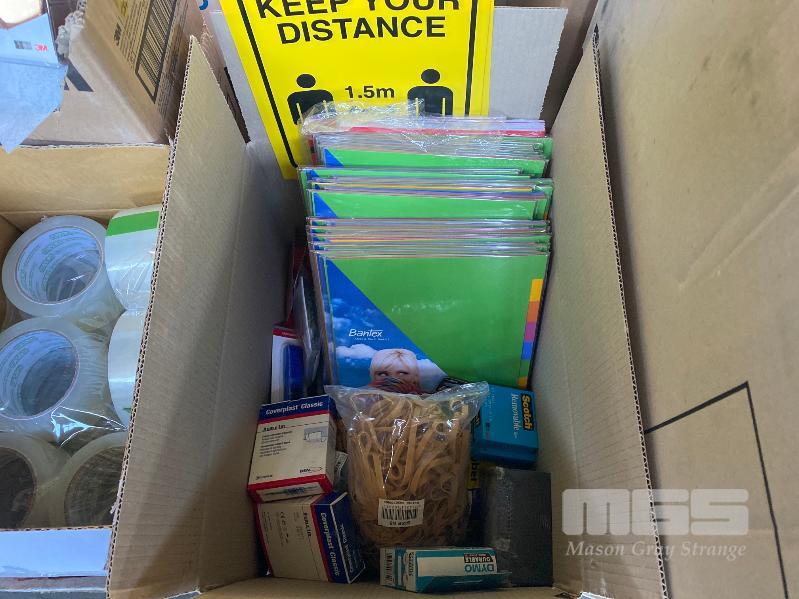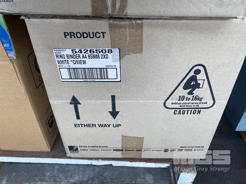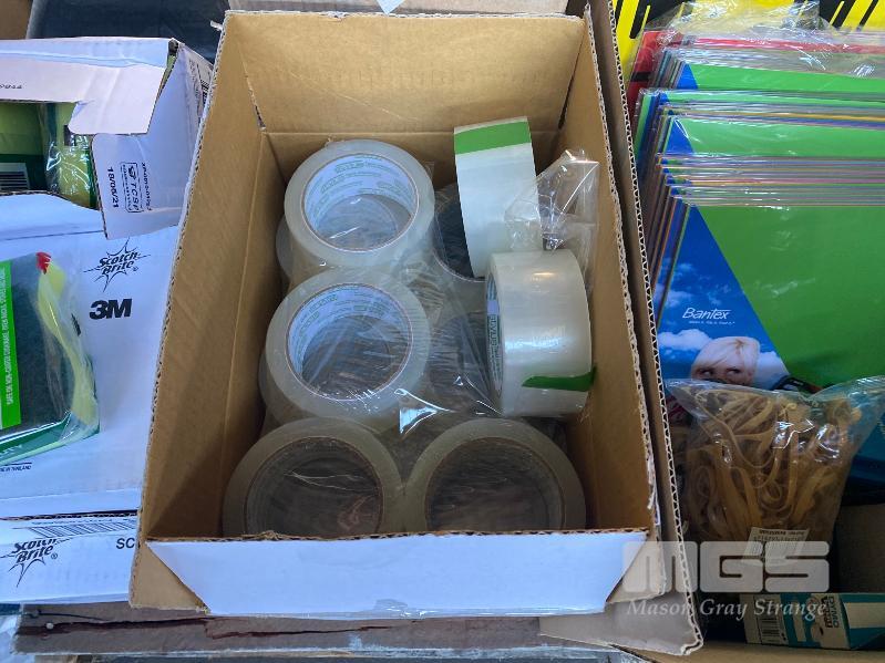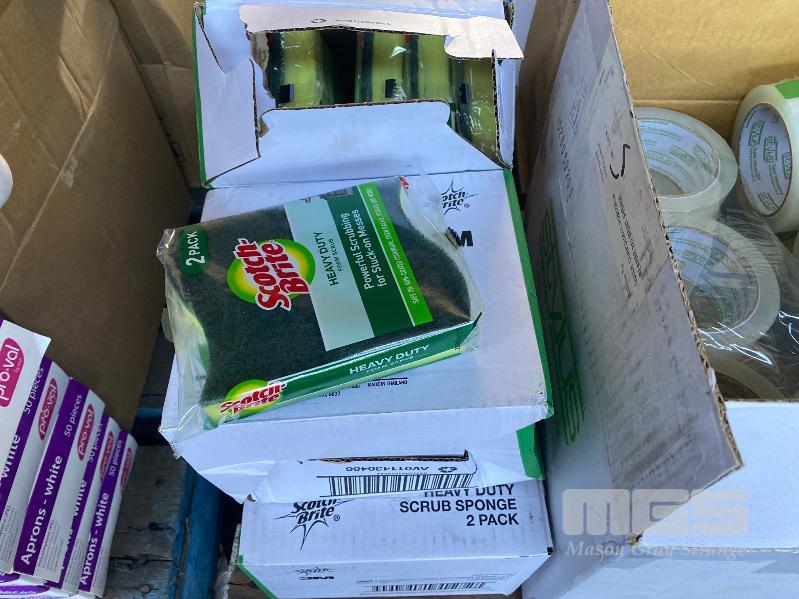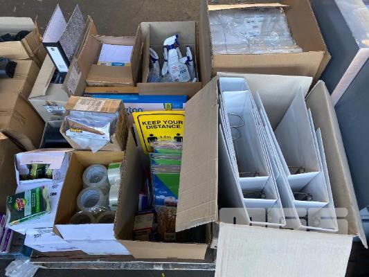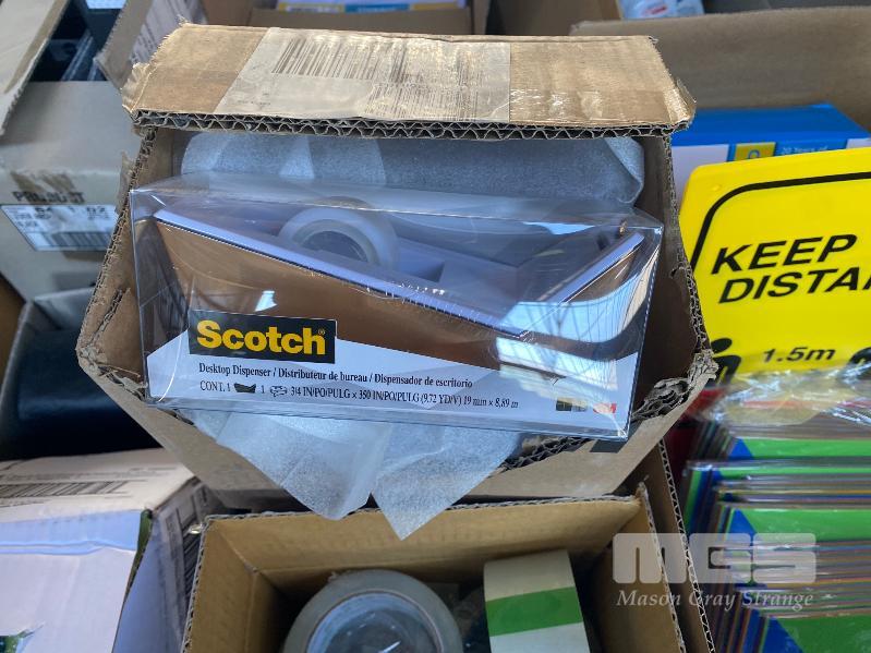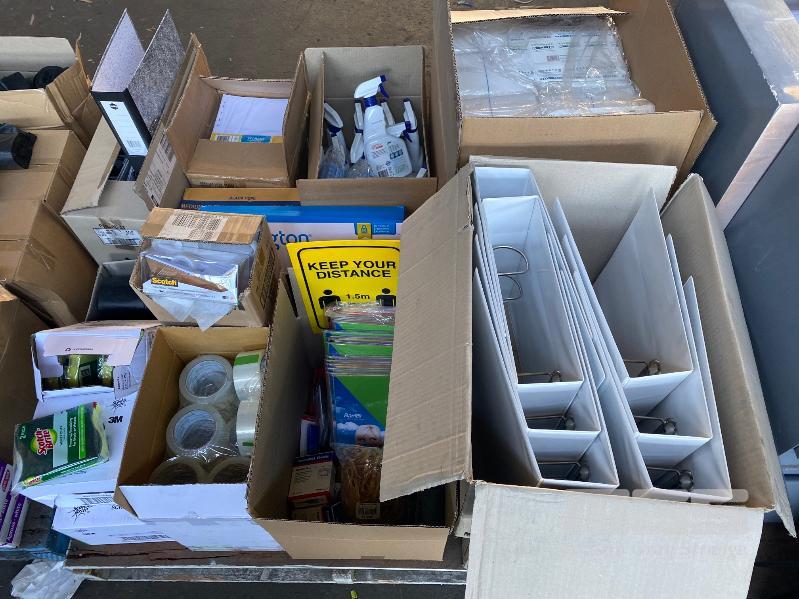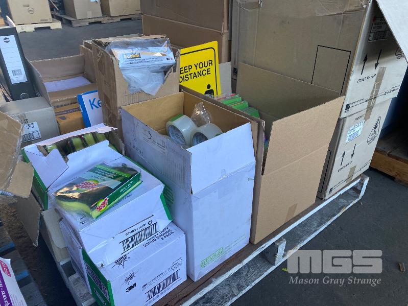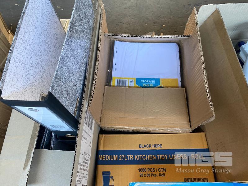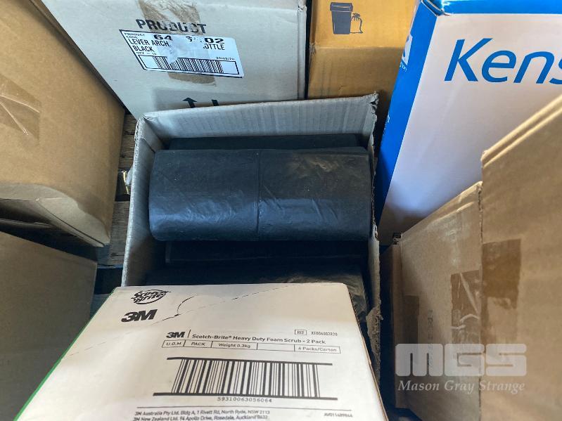 1 x PALLET ASST NEW OFFICE STATIONERY & CLEAING SUPPLIES INC. RING BINDERS, PACKING TAPE, CLEANER, HEAVY DUTY WIPES, SCOTCH TAPE DISPENSERS, SCOTCH-BRITE HEAVY DUTY SPONGES, BIN LINERS, FOOT REST, FIRST AID DRESSINGS ETC