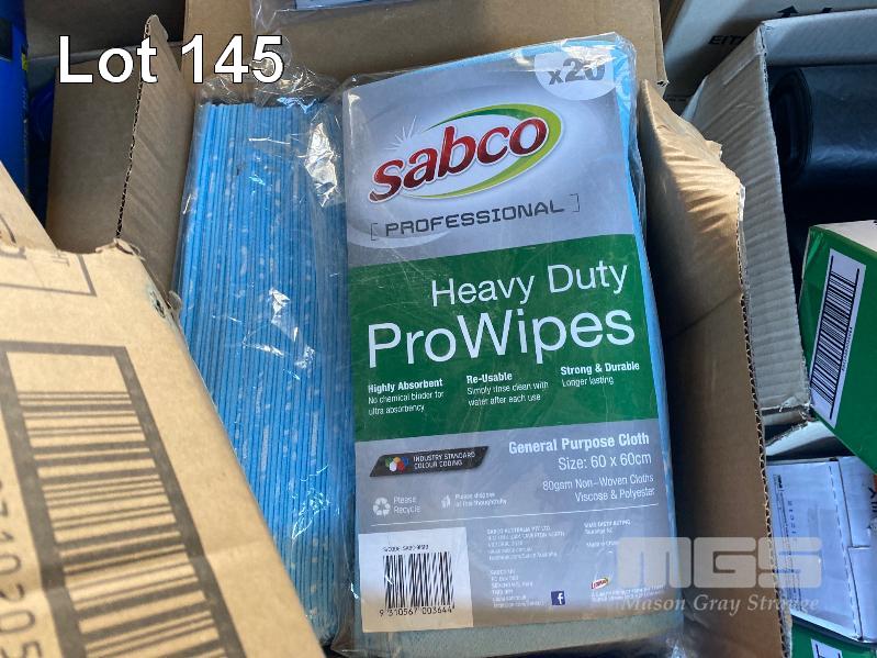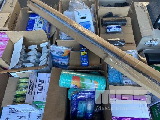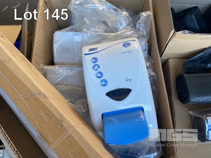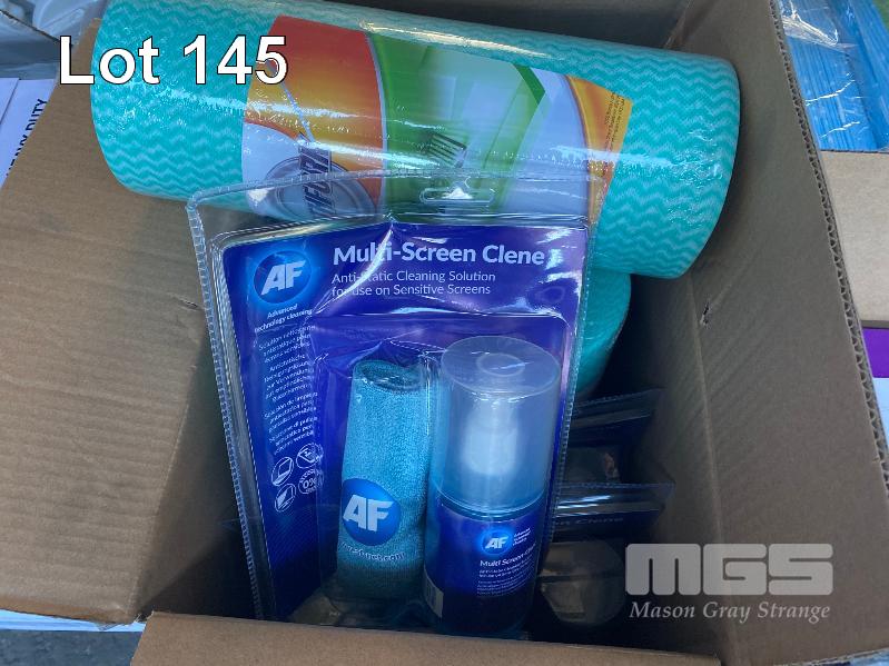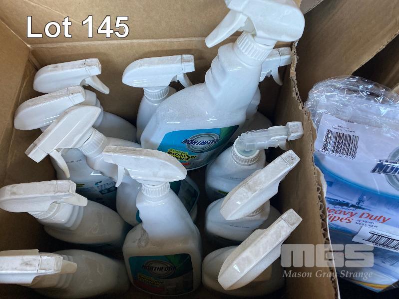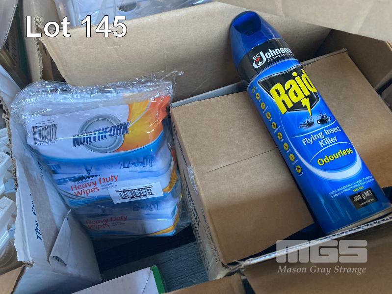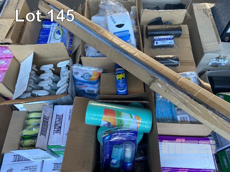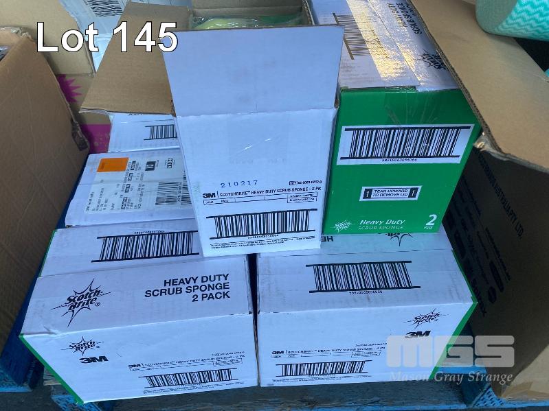 1 x PALLET ASST NEW CLEANING SUPPLIES INC. SCOTCH-BRITE HEAVY DUTY SPONGES, FLY SPRAY, HEAVY DUTY WIPES, APRONS, SCREEN CLEANER, GLOVES, WALL MOUNT SOAP DISPENSERS, BIN LINERS, BATHROOM CLEANER ETC
