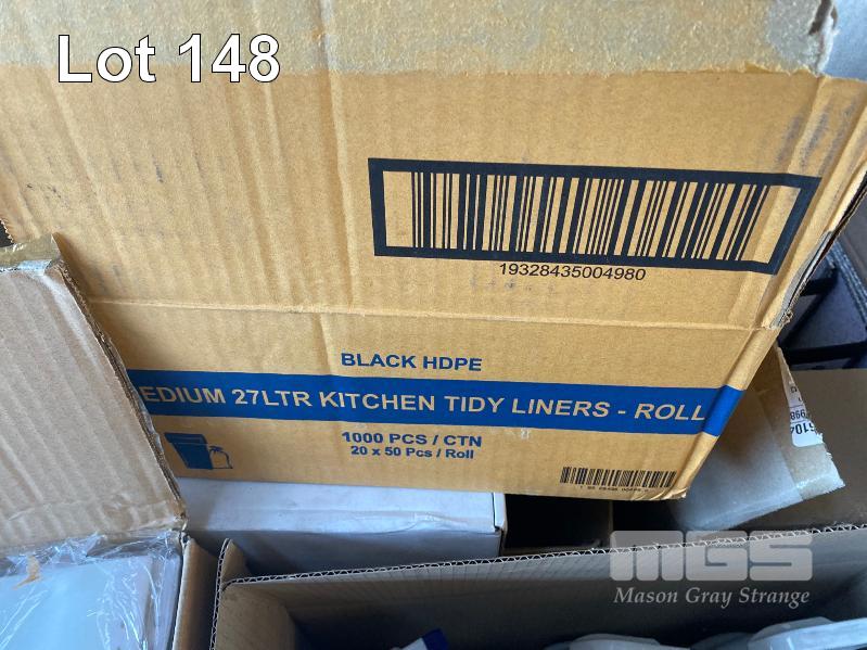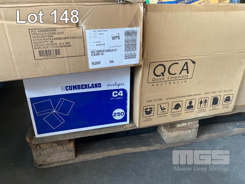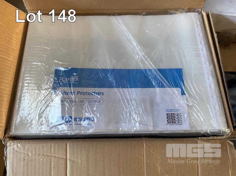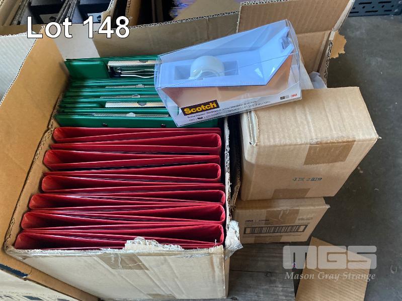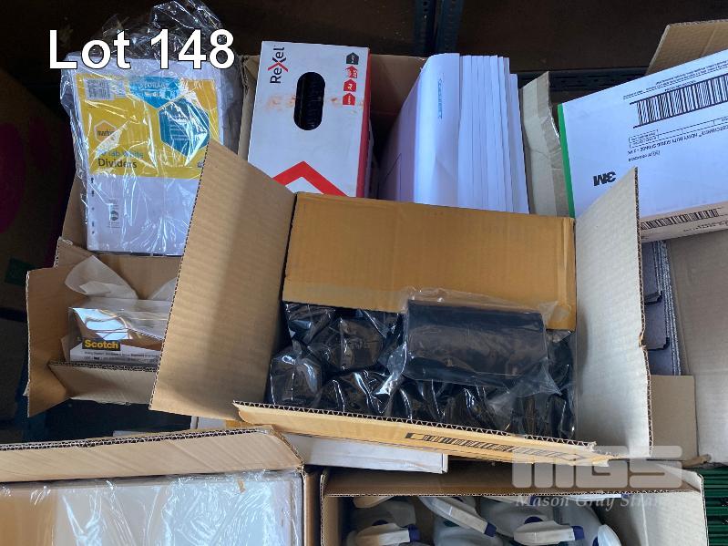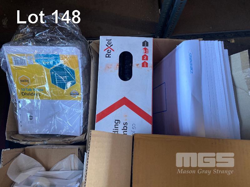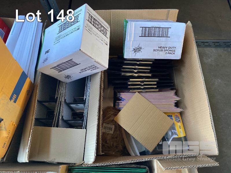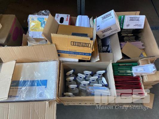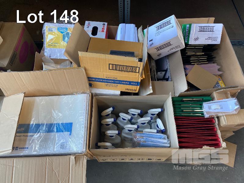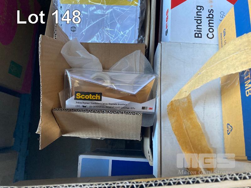 1 x PALLET ASST NEW OFFICE STATIONERY & CLEANING SUPPLIES INC. CLIP BOARDS, ENVELOPES, BIN LINERS, SCOTCH-BRITE HEAVY DUTY SPONGES, SCOTCH TAPE DISPENSERS, MOULD CLEANER, HEAVY DUTY WIPES, BINDING COMBS, TAB DIVIDERS, A3 SHEET PROTECTORS ETC