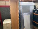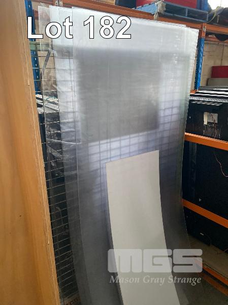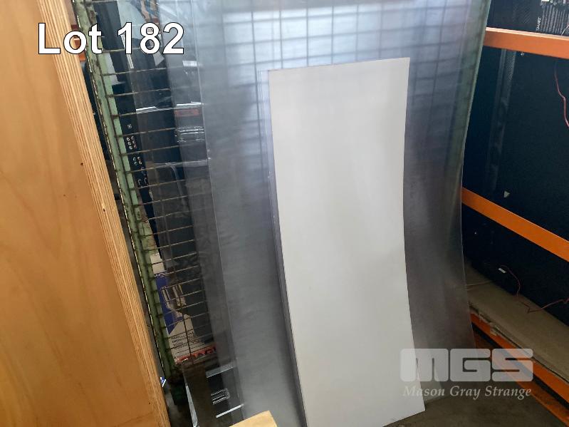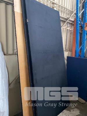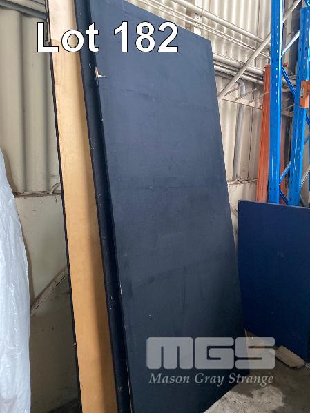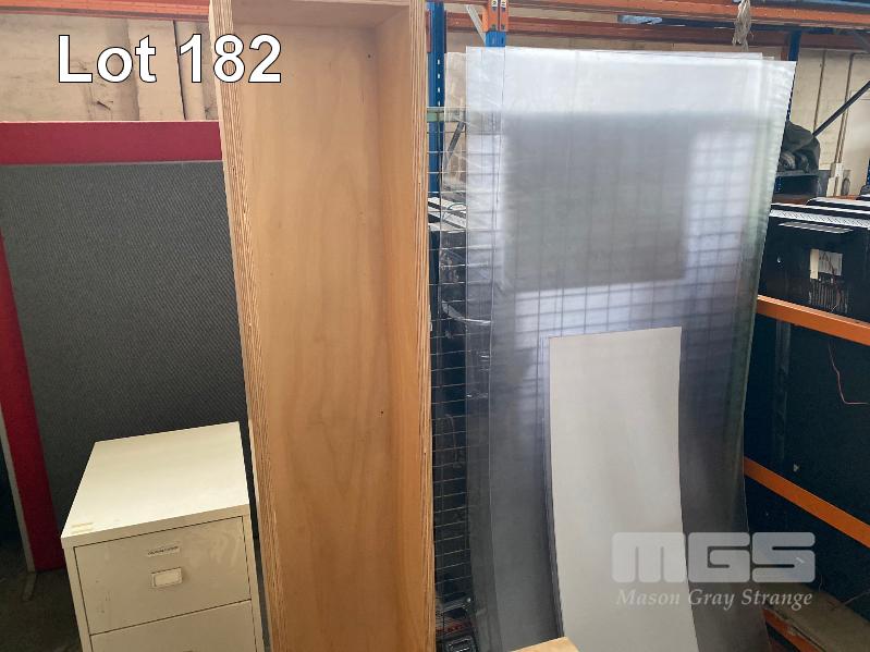 3 x LARGE TIMBER BACKDROPS, WORK HORSE, QTY PERSPEX SHEETS, 2 DRAWER CABINET & STORAGE SHELF