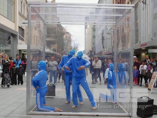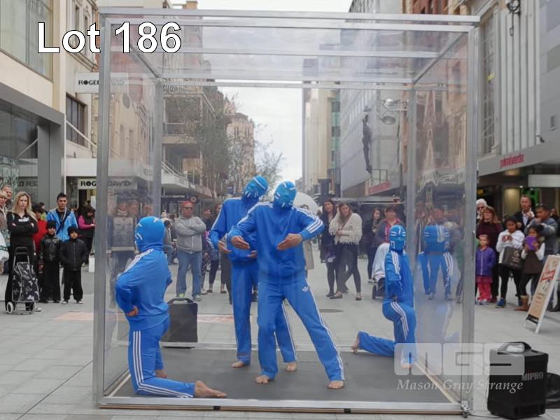 "THE CUBIC MUSEUM" PERFORMACE SET CUBE COMPRISING 5 x PERSPEX, ALUMINIUM FRAMES EACH 265 x 265cm WITH FLOOR