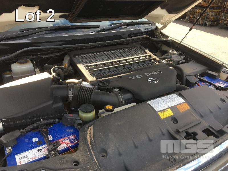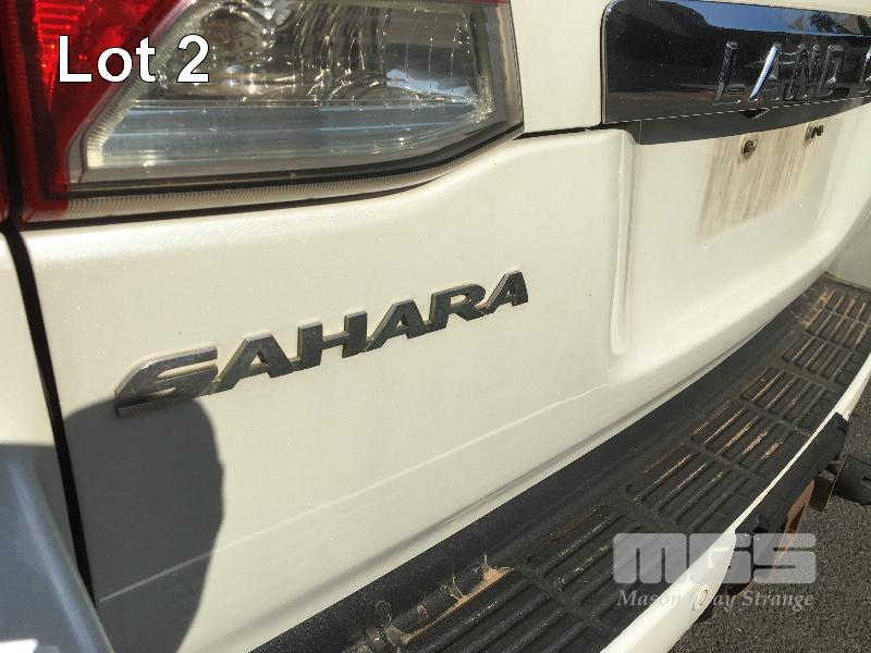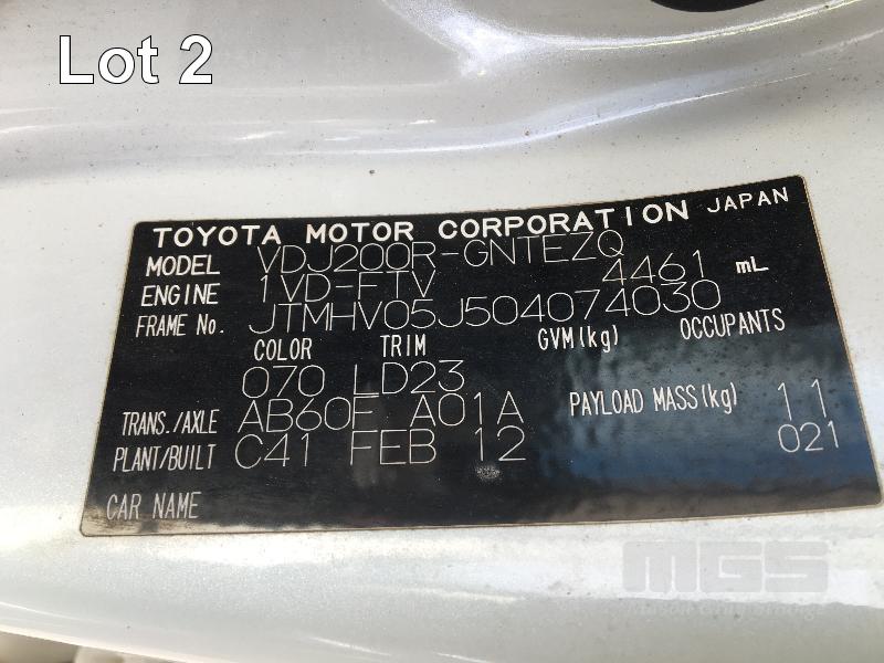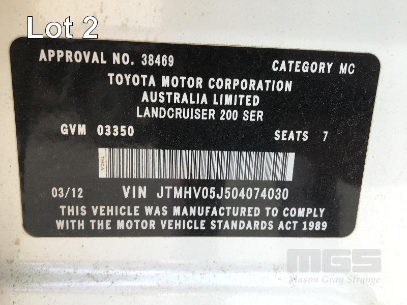 2012 TOYOTA LANDCRUISER VDJ200 R SAHARA 200 SERIES STATION WAGON 4x4 REG: NO PLATES VIN: JTMHV05J507044030 ODO: 279,919kms SHOWING V8 TURBO DIESEL 4.5 LTR, AUTOMATIC TRANSMISSION, WHITE DUCO, 4 DOORS, 7 SEAT, 4x4 ABS, AIR BAG, AIR CON, ALLOY WHEELS, BLUETOOTH, BULL BAR, CD PLAYER, CENTRAL LOCKING, CRUISE CONTROL, IMMOBILISER, LEATHER TRIM, POWER STEERING, POWER WINDOWS, SIDE STEP, SPARE WHEEL, TOW BAR, TRACTION CONTROL, 2 WAY RADIO DUAL BATTERIES KEY #7 (WITH 2 KEY/S)