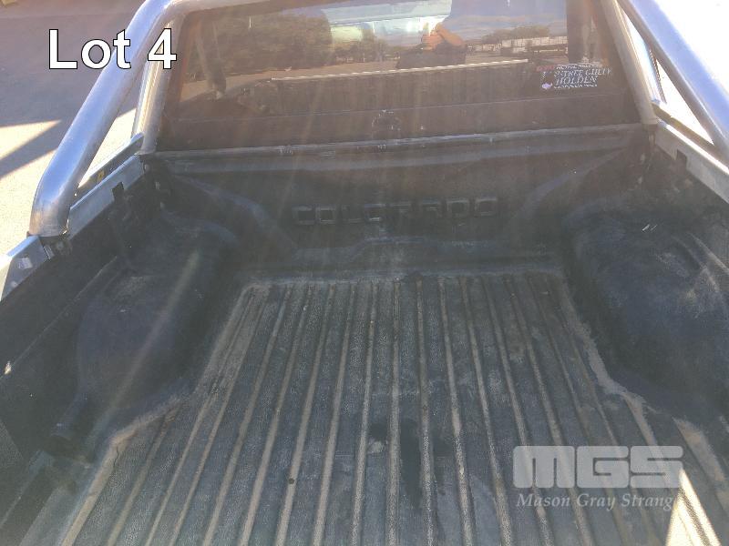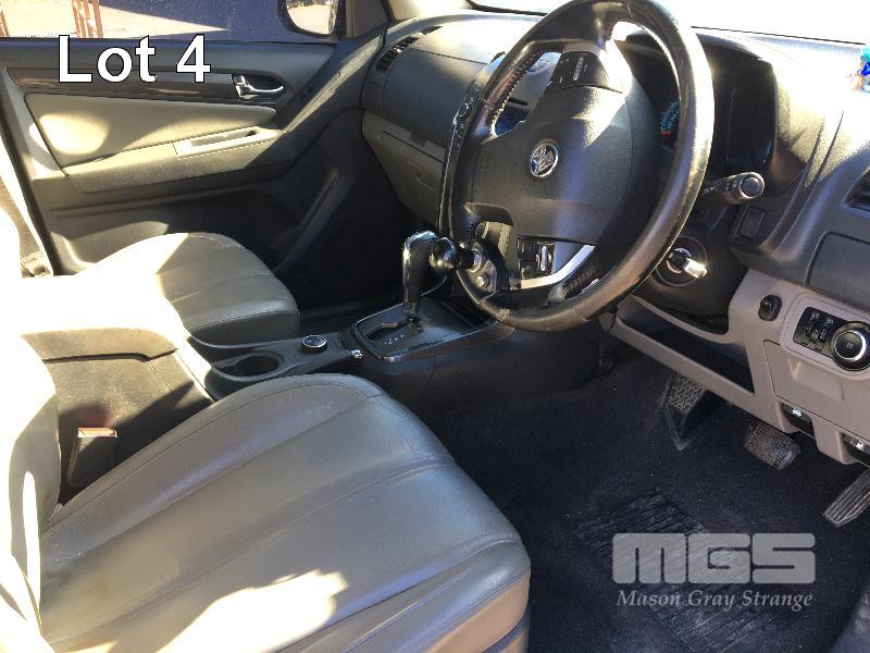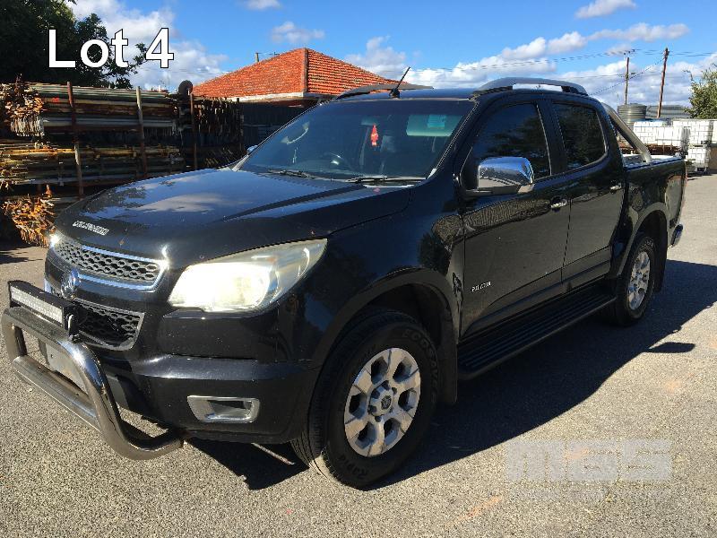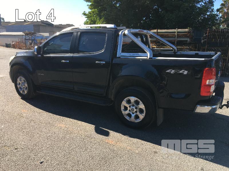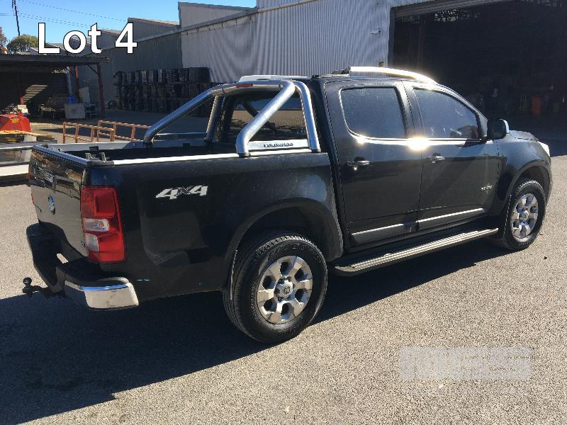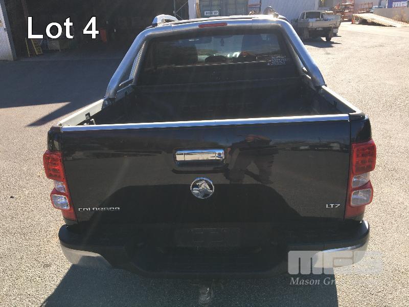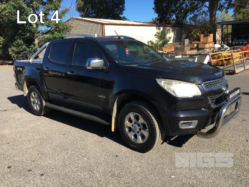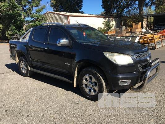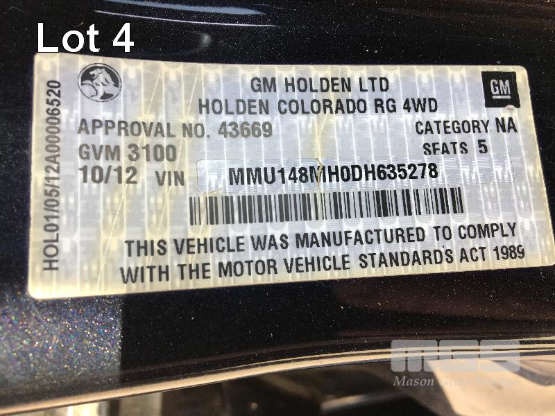 2012 HOLDEN COLORADO LTZ RG DUAL CAB UTILITY 4x4 REG: NO PLATES (SA) VIN: MMU148MH0DH635278 ENG: A9KG122511100 ODO: 248,209kms SHOWING 2.8 LITRE, 4 CYLINDER, AUTOMATIC TRANSMISSION, TURBO DIESEL, BLACK DUCO, 4 DOORS, 5 SEAT, 4x4 ABS, AIR BAG, AIR CON, ALLOY WHEELS, CD PLAYER, CENTRAL LOCKING, CRUISE CONTROL, IMMOBILISER, NUDGE BAR, POWER STEERING, POWER WINDOWS, SIDE STEP, SPARE WHEEL, SPOT LIGHTS, TOW BAR, ALLOY ROLL BAR KEY #17 (WITH PAPERS, WITH 1 KEY/S)