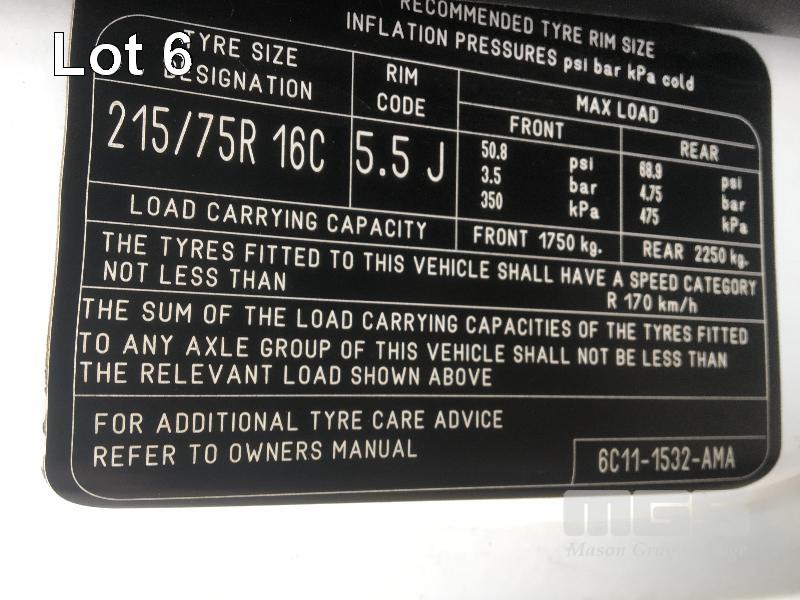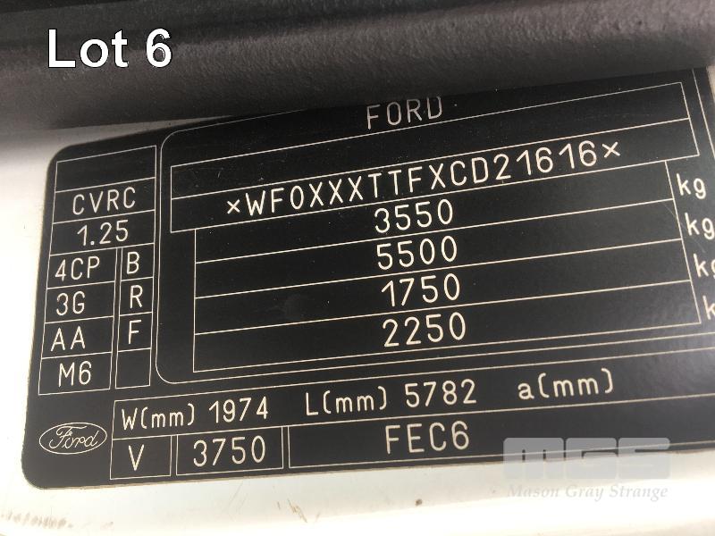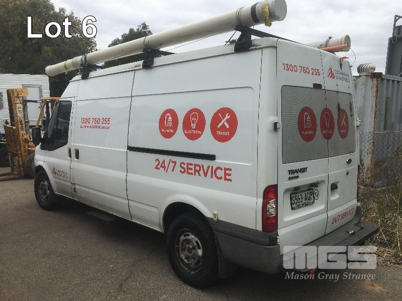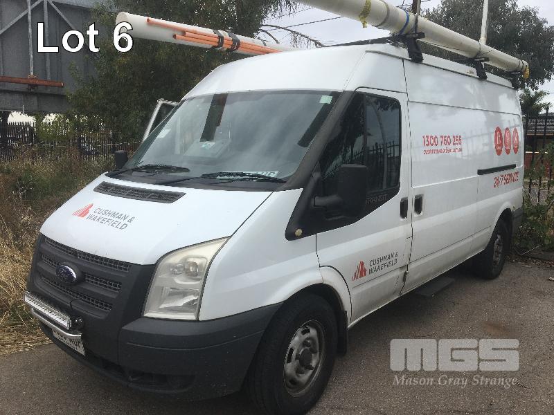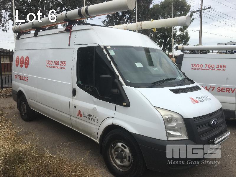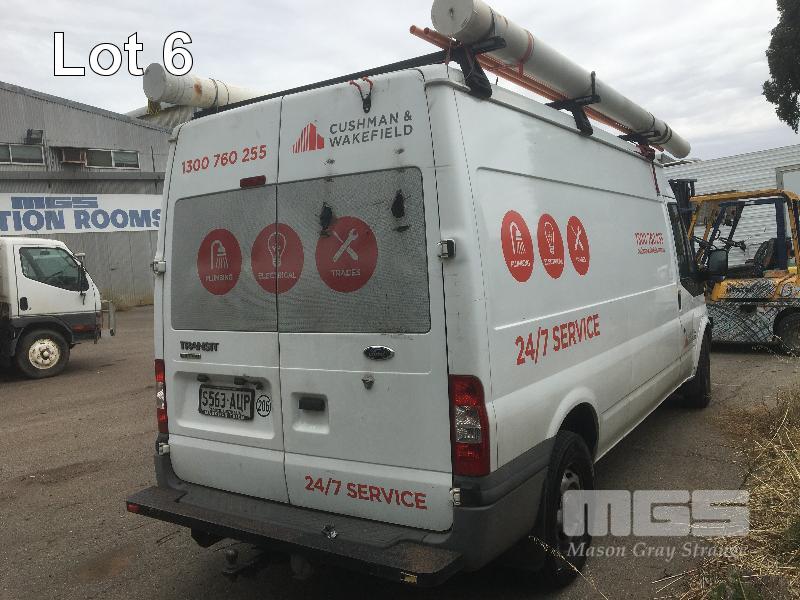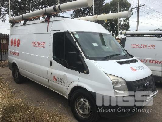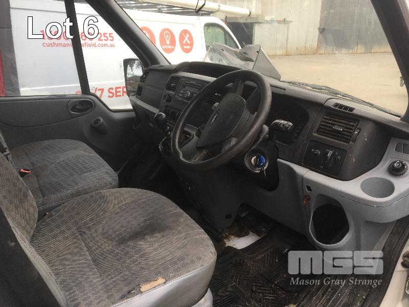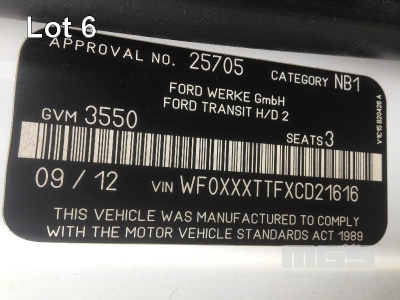 09/2012 (CP) FORD TRANSIT T350 VAN 4x2 REG: S563 AUP (SA) VIN: WF0XXXTTFXCD21616 ENG: CVRCCD21616 ODO: 152,539kms SHOWING 4 CYLINDER PETROL, 6 SPEED MANUAL TRANSMISSION, WHITE DUCO, 2 DOORS, 3 SEAT, 4x2 ABS, AIR BAG, AIR CON, CARGO BARRIER, CD PLAYER, CENTRAL LOCKING, IMMOBILISER, POWER STEERING, POWER WINDOWS, ROOF RACKS, SHELVING, SPARE WHEEL, SPOT LIGHTS, TRADEMANS FITOUT, DUAL BATTERIES KEY #24 (WITH PAPERS, WITH 2 KEY/S)