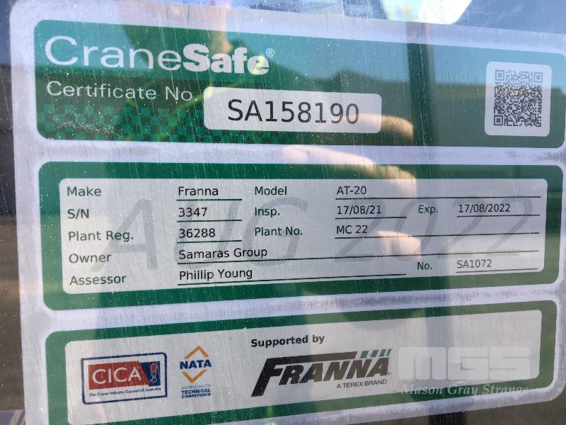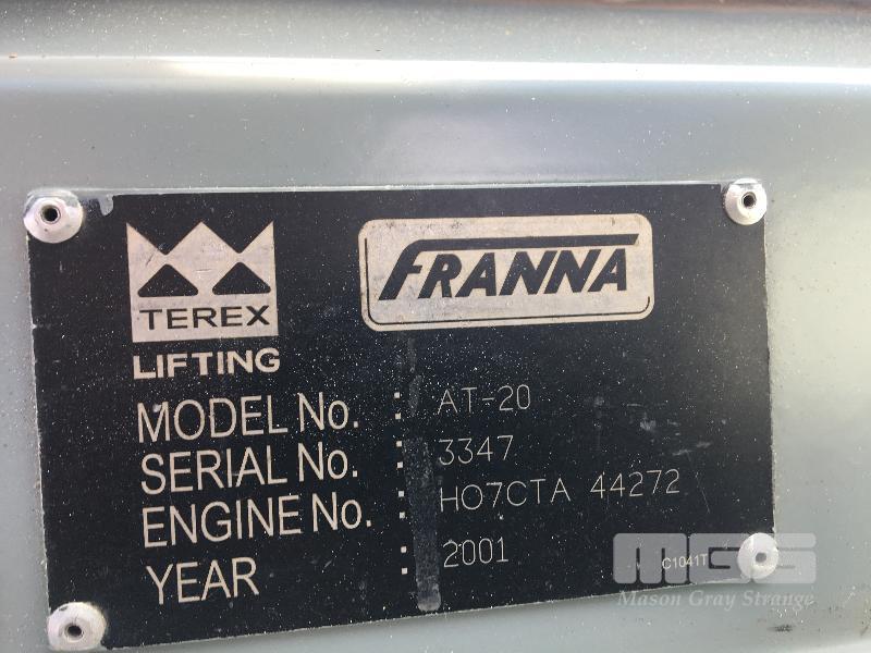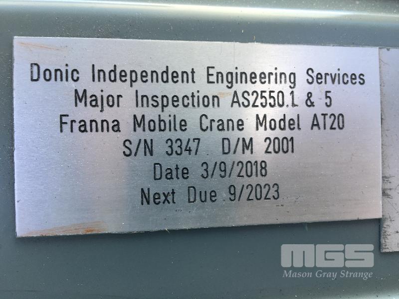 MOBILE CRANE, 2001 TEREX FRANNA MOD: AT-20 S/NO: 3347 REGT: FPS 684 (SA) ENG: H07CTA44272 KMS SHOWING: 222,456 HRS SHOWING: 7099 6 CYLINDER DIESEL TURBO ENGINE AUTOMATIC TRANSMISSION MRC 20 TONNE FITTED WITH FRANNA RCI-1502 LOAD COMPUTER BATTERY ISOLATION SWITCH, ALLOY LADDER, TELESCOPIC SPREADER BAR, ASSORTED STORAGE BOXES CRANE SAFE INSPECTION CERT. EXP 17/8/22 MAJOR INSPECTION CERT EXP 9/2023 WITH MANUALS KEY #34