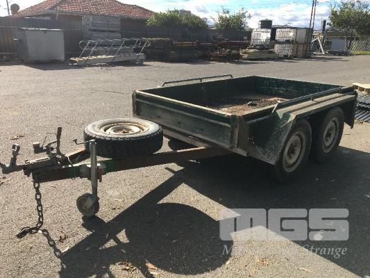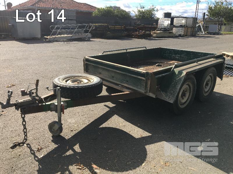 8x5' TANDEM AXLE TRAILER REG: YFJ 123 (SA) CHECKER PLATE STEEL BALL HITCH HINGED FRONT & REAR GATES BRAKES, JOCKEY WHEEL, SPARE WHEEL TYRES: 205R16 IN AVERAGE CONDITION (HAS SOME RUST HOLES)