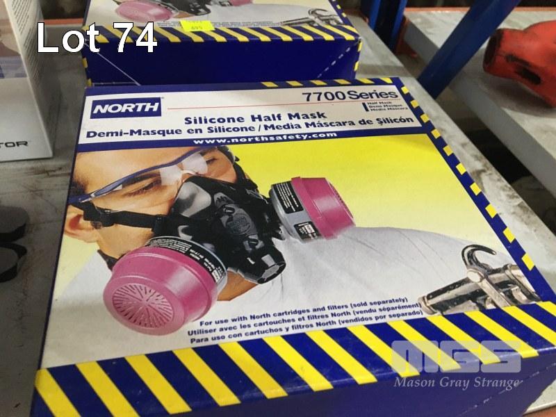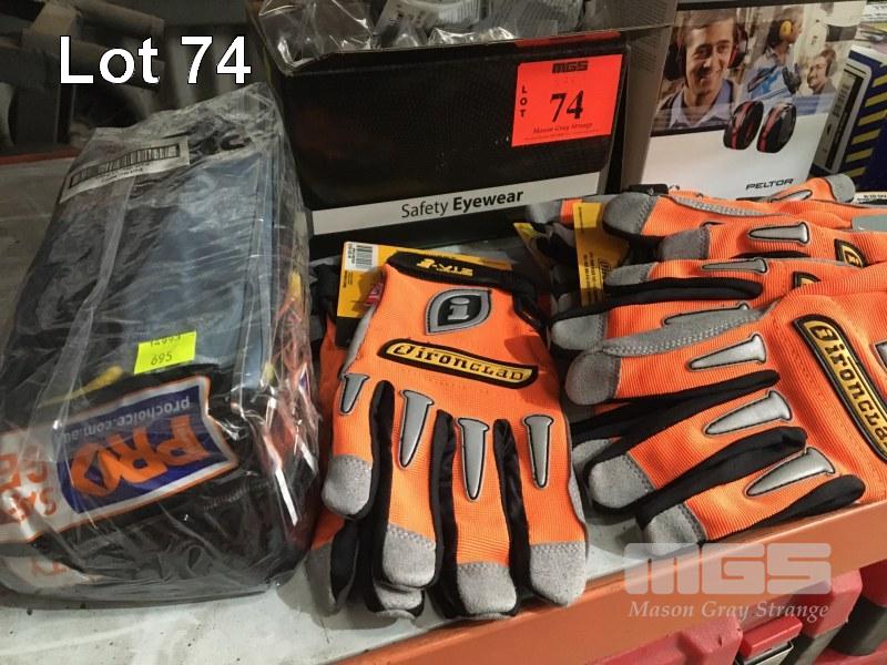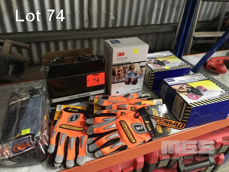 2 x SILICONE RESPIRATOR MASKS, NORTH, 7700 SERIES, 12 x PAIRS PRO SENSE SAFETY GRIP GLOVES, 6 x PAIRS IRON CLAD RIGGERS GLOVES, HI-VIS, 12 x PAIRS MSA SAFETY GLASSES, NULLARBOR NEX GEN & PAIR 3M HARD HAT EAR MUFFS, (AS NEW)