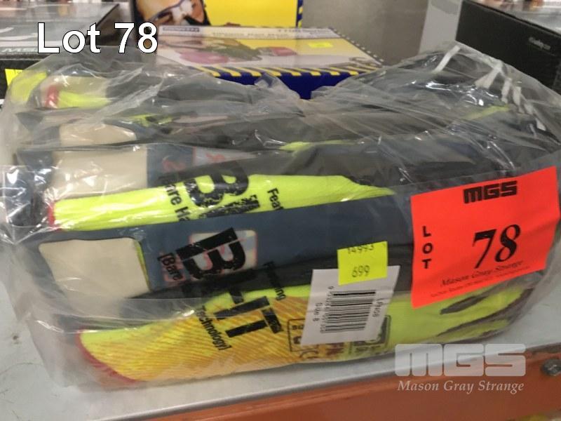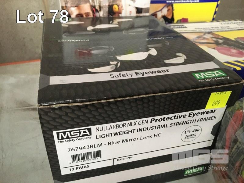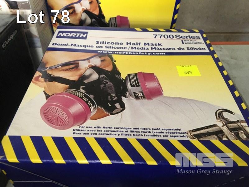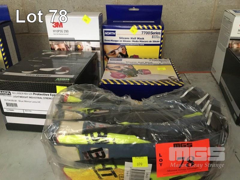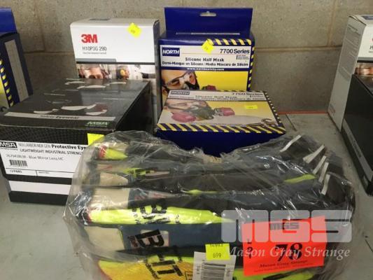 2 x SILICONE RESPIRATOR MASKS, NORTH, 7700 SERIES, 12 x PAIRS PRO SENSE SAFETY GRIP GLOVES, 12 x PAIRS MSA SAFETY GLASSES, NULLARBOR NEX GEN & PAIR 3M HARD HAT EAR MUFFS, (AS NEW)