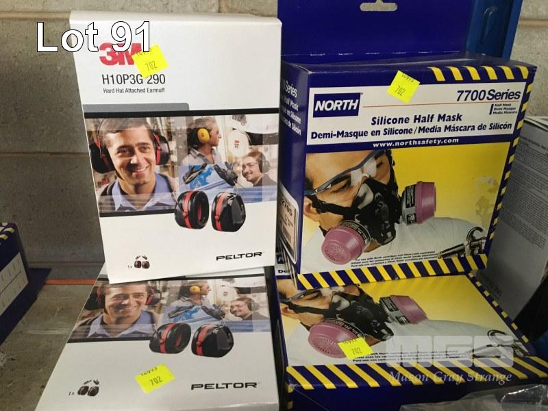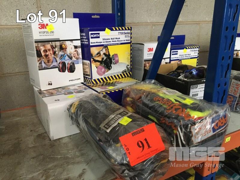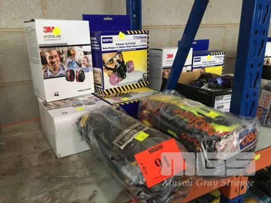 2 x SILICONE RESPIRATOR MASKS, NORTH, 7700 , 2 x PAIRS 3M PECTOR HARD HAT EAR MUFFS, 12 x PAIRS PRO SENSE SAFETY GRIP GLOVES, 12 x PAIRS PRO SENSE STINGA BHT SAFETY GLOVES, (AS NEW)