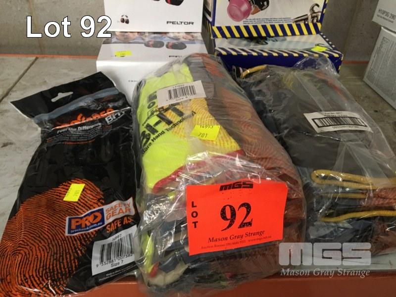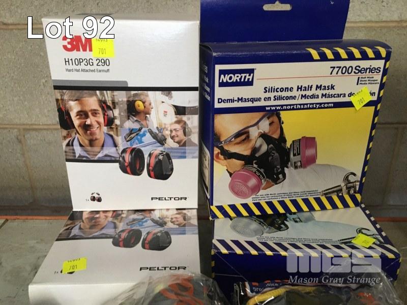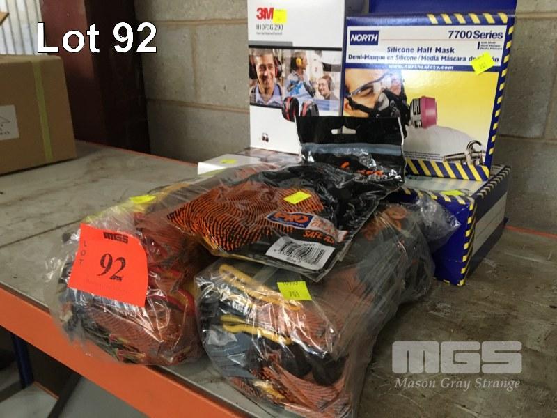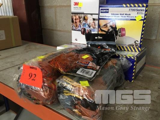 2 x SILICONE RESPIRATOR MASKS, NORTH, 7700 , 2 x PAIRS 3M PECTOR HARD HAT EAR MUFFS, 12 x PAIRS PRO SENSE SAFETY GRIP GLOVES, 12 x PAIRS PRO SENSE STINGA BHT SAFETY GLOVES, (AS NEW)