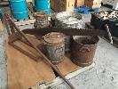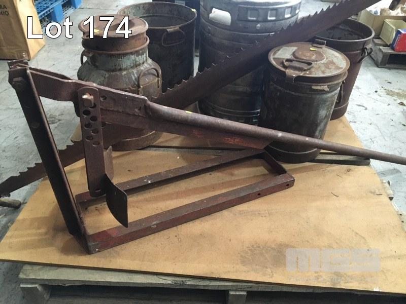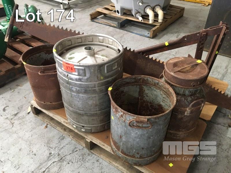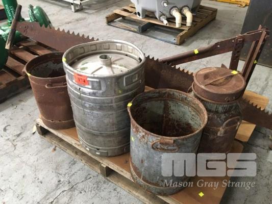 TYRE BEAD BREAKER, VINTAGE 2 MAN CROSSCUT SAW, 2 x METAL CREAM CANS, 2 x MILK CANS & 1 x STAINLESS STEEL KEG, 1 x PALLET