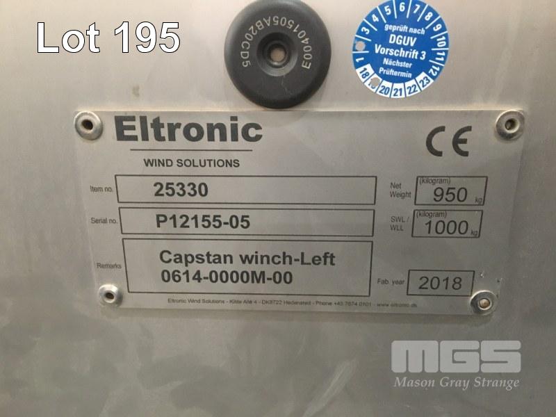 CAPSTAN ELECTRONIC WINCH, MOD: 2533 ELTRONIC WIND SOLUTIONS SWL: 1,000kg S/NO: P12155-05 CAPSTAN WINCH LEFT 0614-0000M-00 DOM: 2018 FOOT PEDAL CONTROLS SKID BASE MOUNTED WITH FORK POCKETS & LIFTING POINTS MASS: 950kg 415V